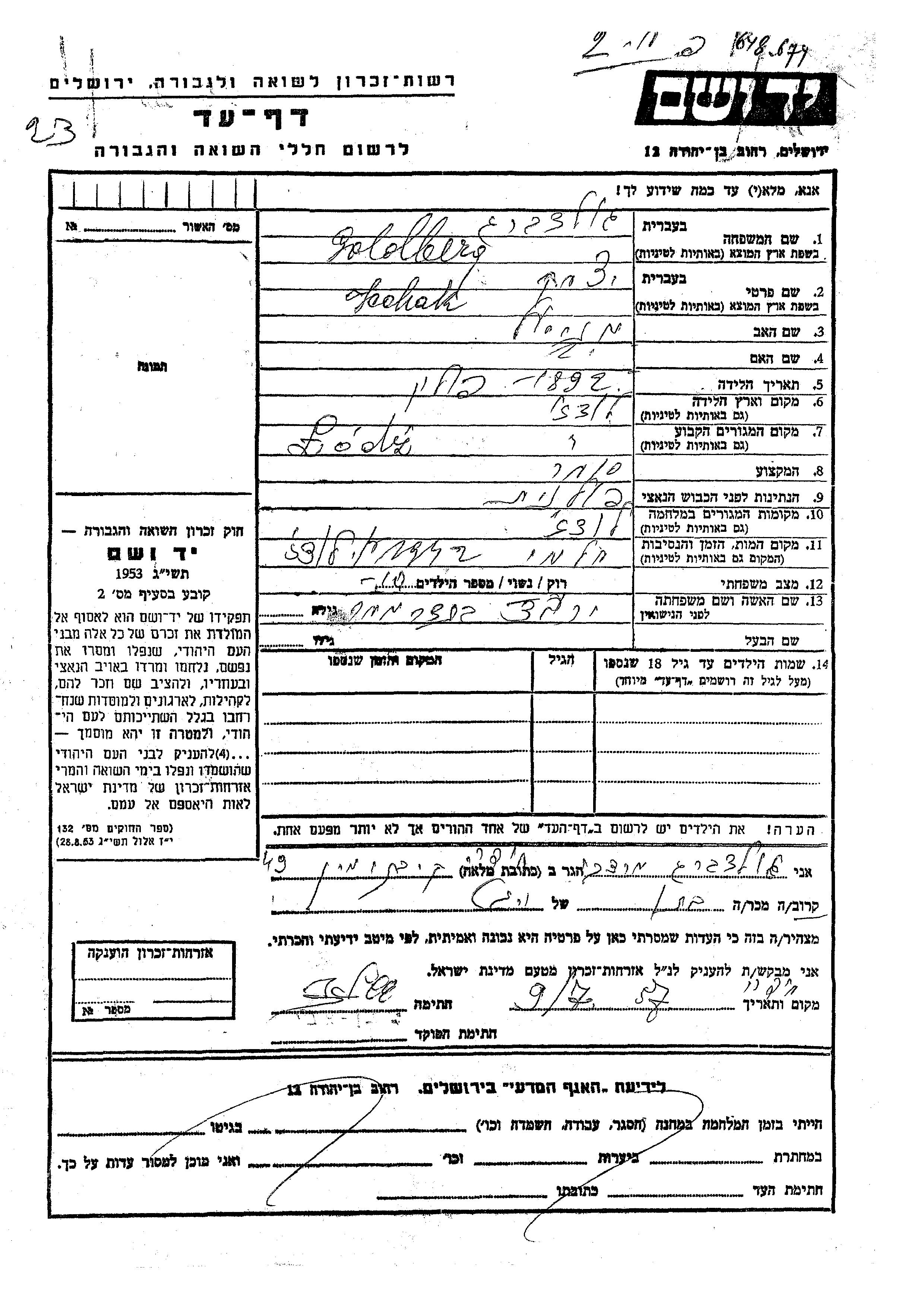 Icchak Goldberg was born in Lodz, Poland, 1892 to Manuel. He was a merchant and married to Yokheved nee Bendermakher. Prior to WWII he lived in Lodz, Poland. During the war he was in Lodz, Poland. Icchak was murdered in the Shoah. Place of death: Chelmno, Poland, 1942.