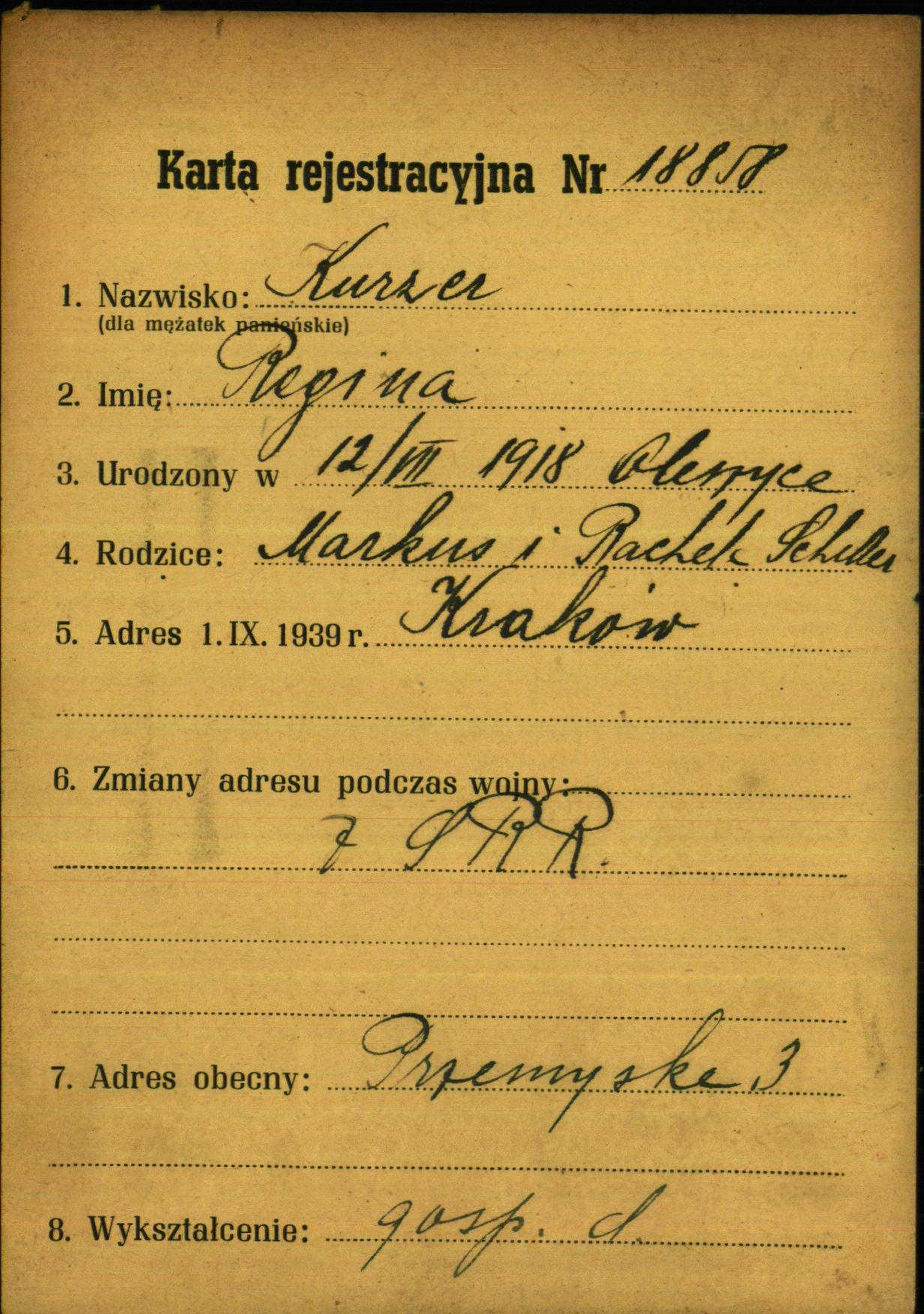 Regina Kuczer was born in Oleszyce, Poland, 1918 to Markus and Rachela. She was a housewife. Prior to WWII she lived in Krakow, Poland. During the war she was in Soviet Union. Regina survived the Shoah.