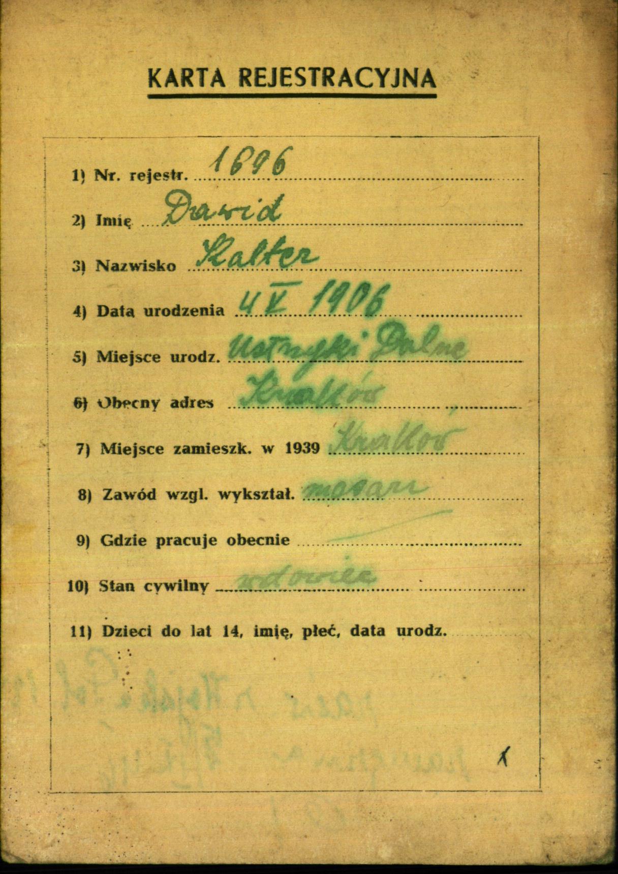 Dawid Kalter was born in Ustrzyki Dolne, Poland, 1906. He was a masarz and a widower. Prior to WWII he lived in Krakow, Poland.