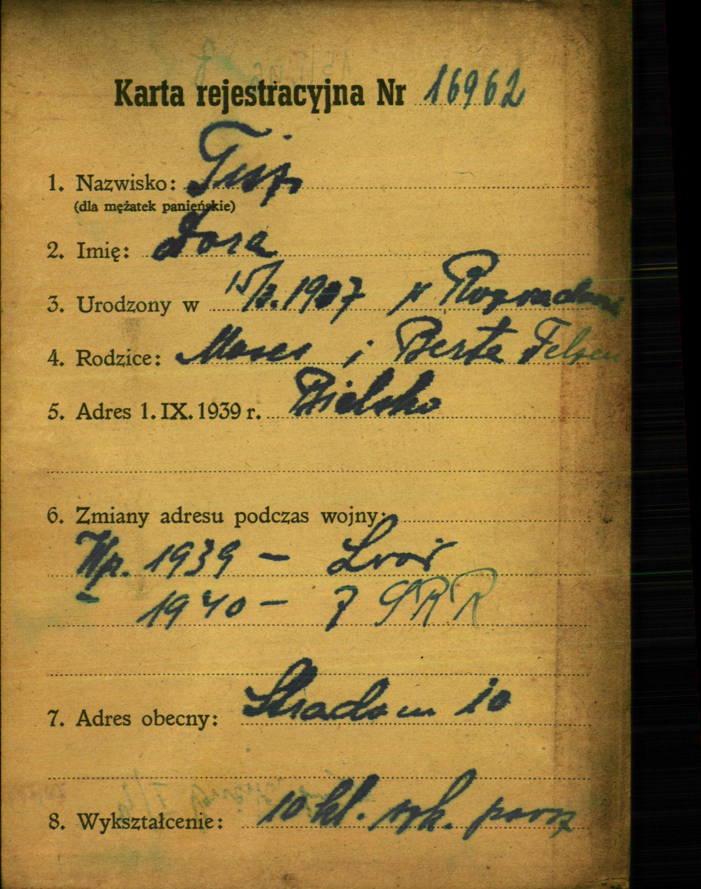 Dora Tisz was born in Rozwadów, Poland, 1907. Prior to WWII she lived in Bielsko, Poland. During the war she was in Soviet Union.