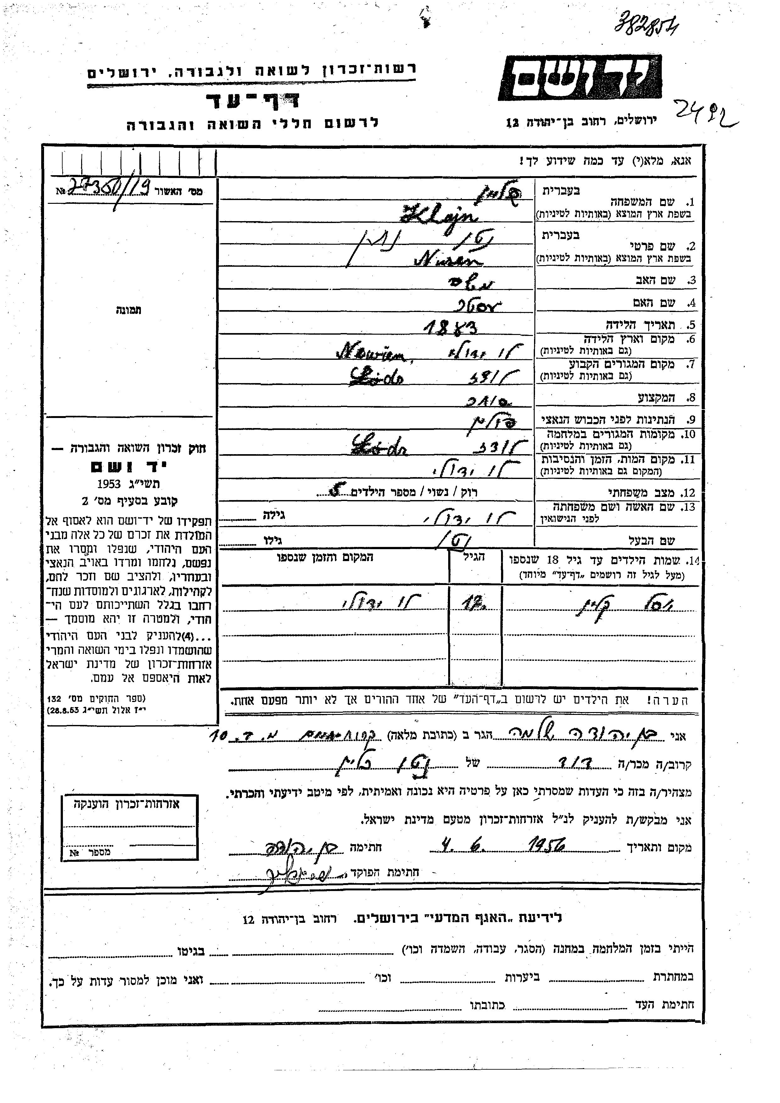 Nusen Klejn was born, 1883 to Moshe and Ester. He was a merchant and married. Prior to WWII he lived in Lodz, Poland. During the war he was in Lodz, Poland. Nusen was murdered in the Shoah.