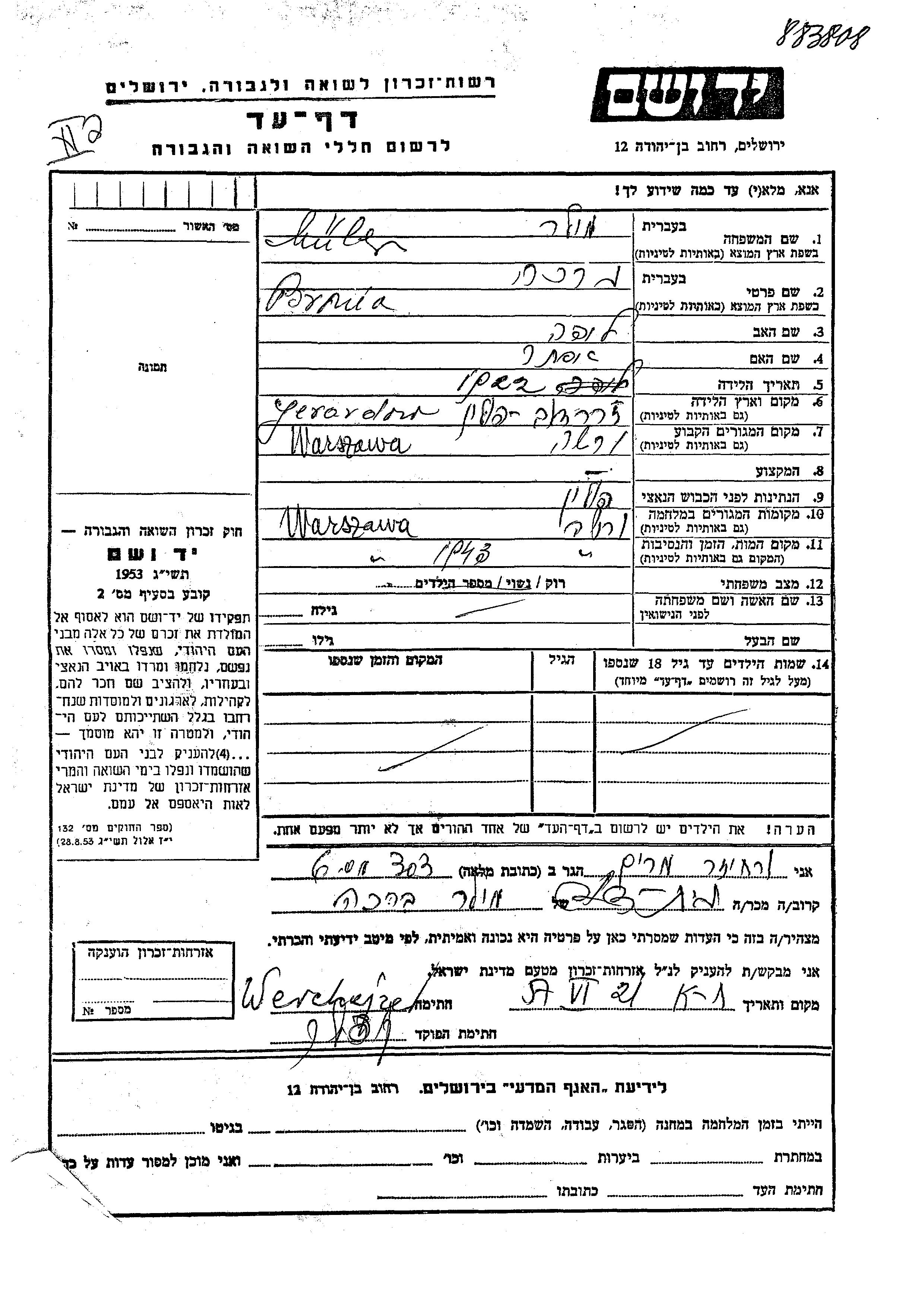 Braha Mueler was born in Zyrardow, Poland, 1922 to Lipa and Ester. She was married. Prior to WWII she lived in Warszawa, Poland. During the war she was in Warszawa, Poland. Braha was murdered in the Shoah. Place of death: Warszawa, Poland, 1943.