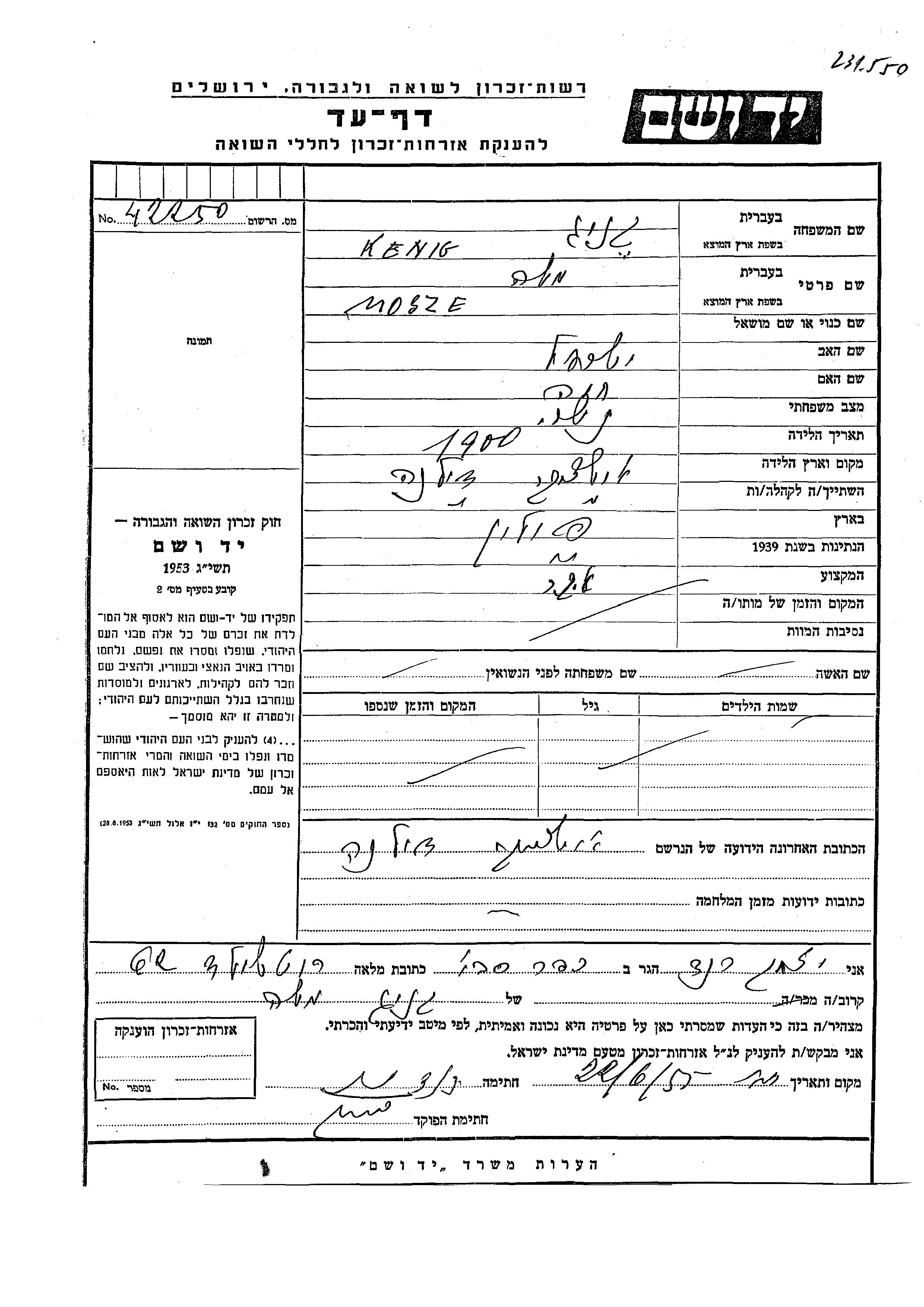 Mosze Kenig was born in Ustrzyki Dolne, Poland, 1900 to Yisrael and Khava. He was a carpenter and married. Prior to WWII he lived in Ustrzyki Dolne, Poland. During the war he was in Ustrzyki Dolne, Poland. Mosze was murdered in the Shoah.
