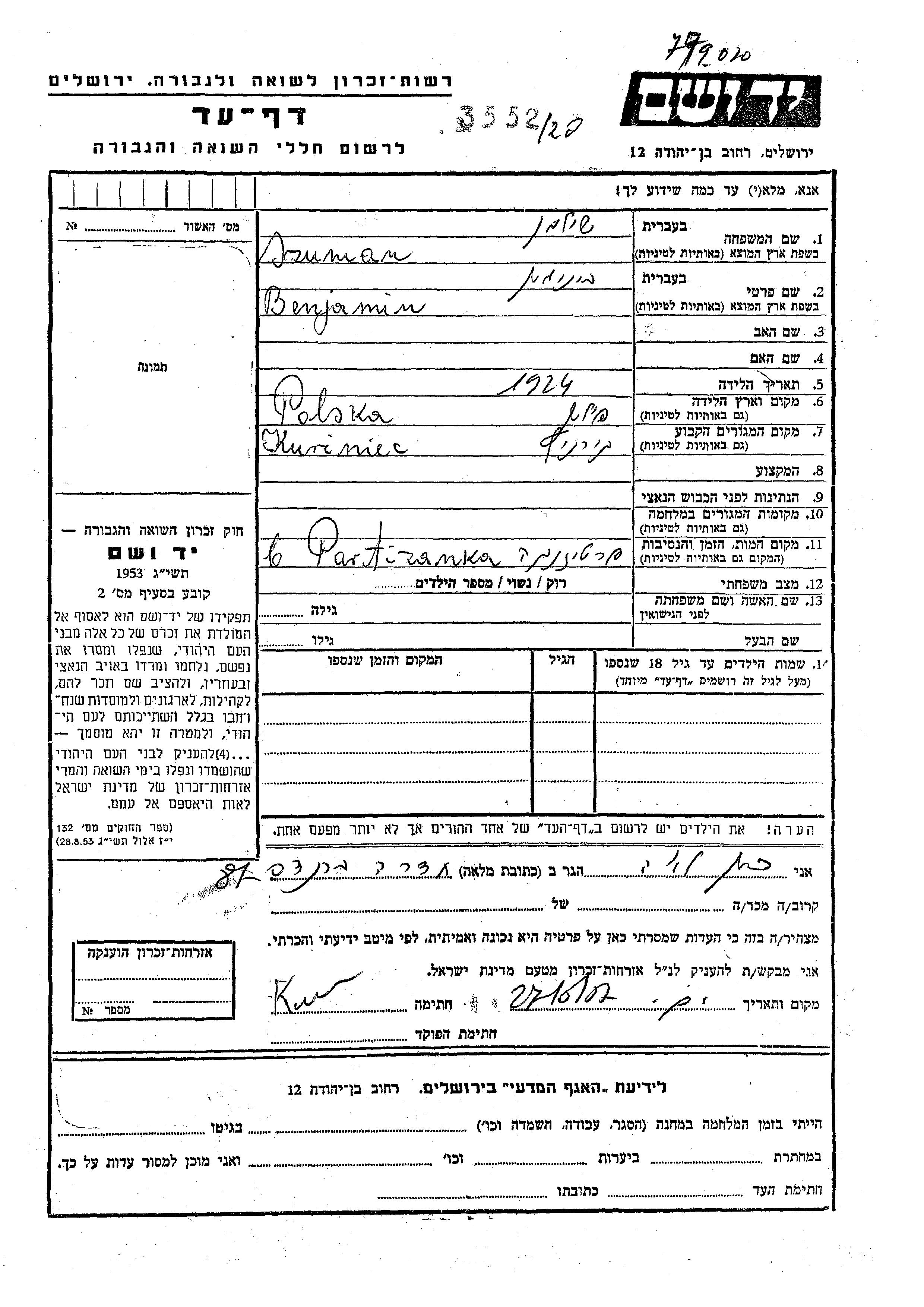 Szuman Shulman Benjamin 1924 Kurzeniec, Poland Page of Testimony