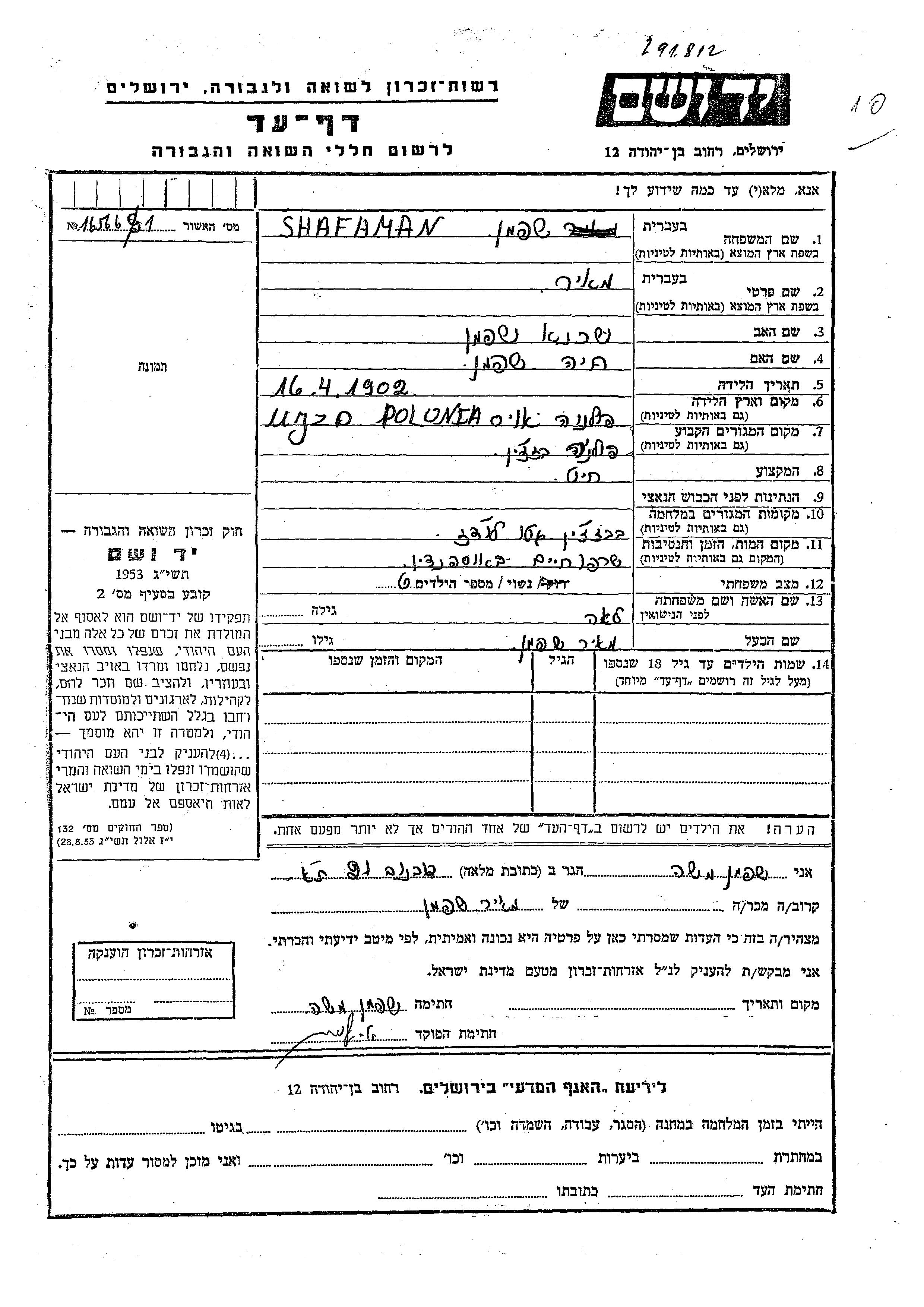 Meir Shafaman was born in Ujazd, Poland, 1902 to Shakhna and Khaia. He was a tailor and married to Lea. Prior to WWII he lived in Brzeżany, Poland. During the war he was in Lodz, Poland. Meir was murdered in the Shoah. Place of death: Auschwitz, Poland.