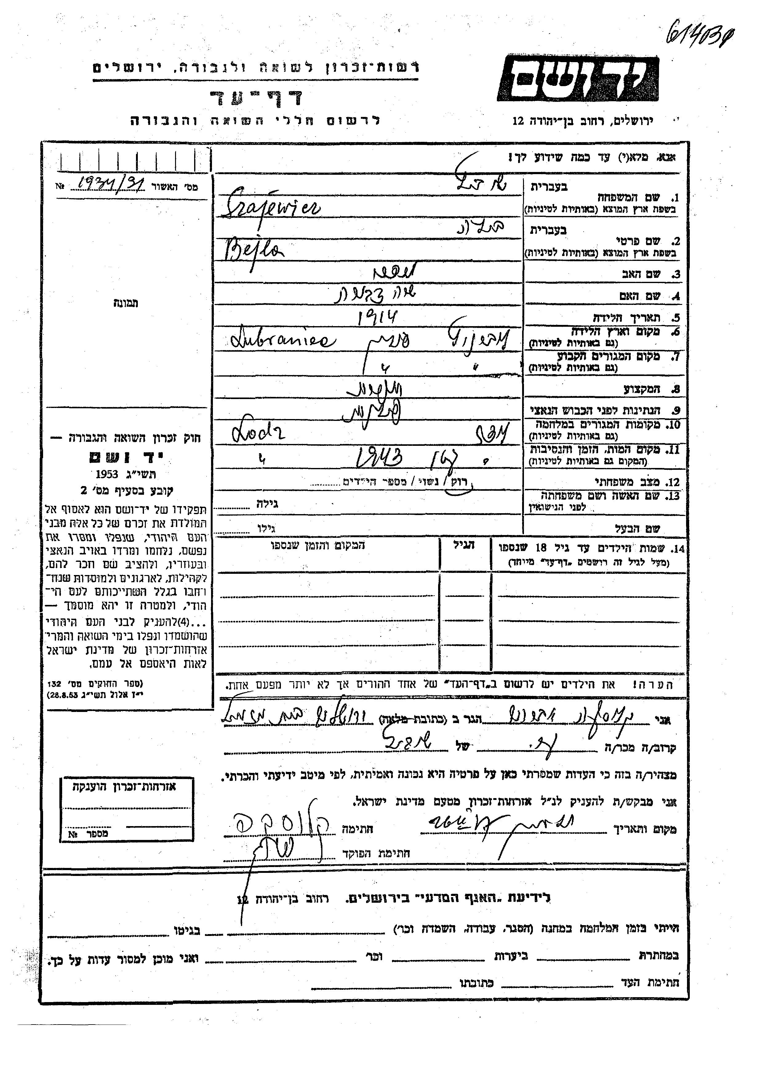 Beila Szajewicz was born in Lubraniec, Poland, 1914 to Mordekhai and Sara Dvora. She was a seamstress and single. Prior to WWII she lived in Lubraniec, Poland. During the war she was in Lodz, Poland. Beila was murdered in the Shoah. Place of death: Lodz, Poland, 1943.