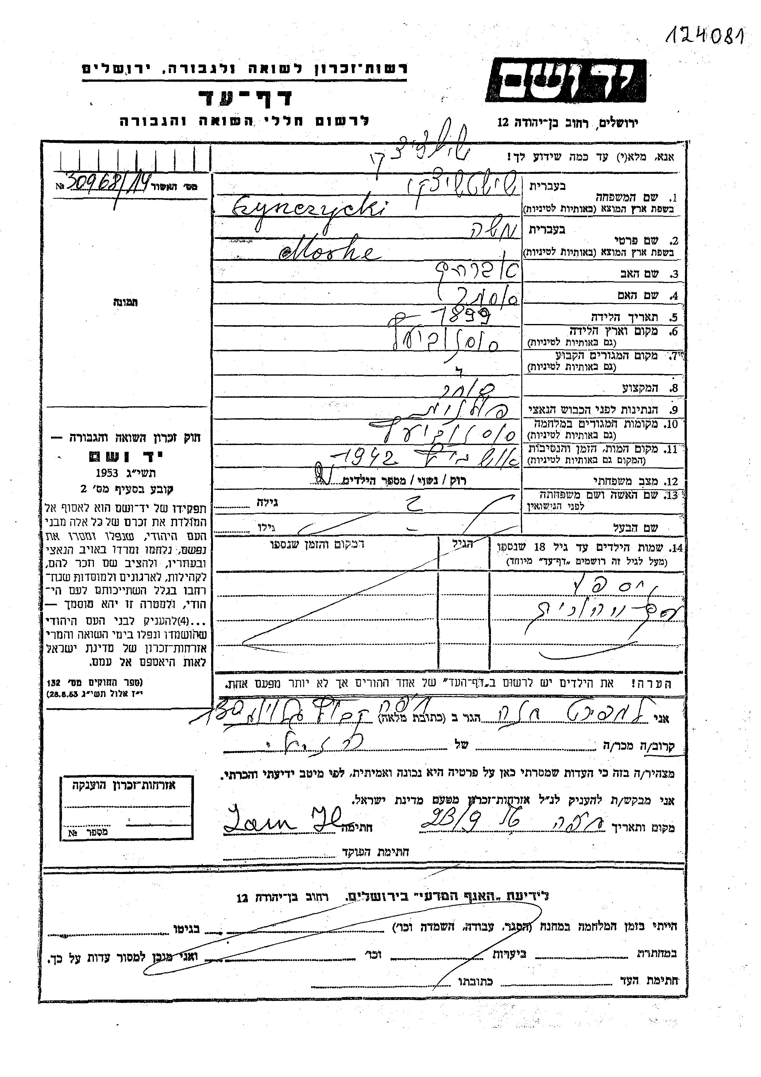 Szyszczycki Moshe 1899 Sosnowice, Poland Page of Testimony
