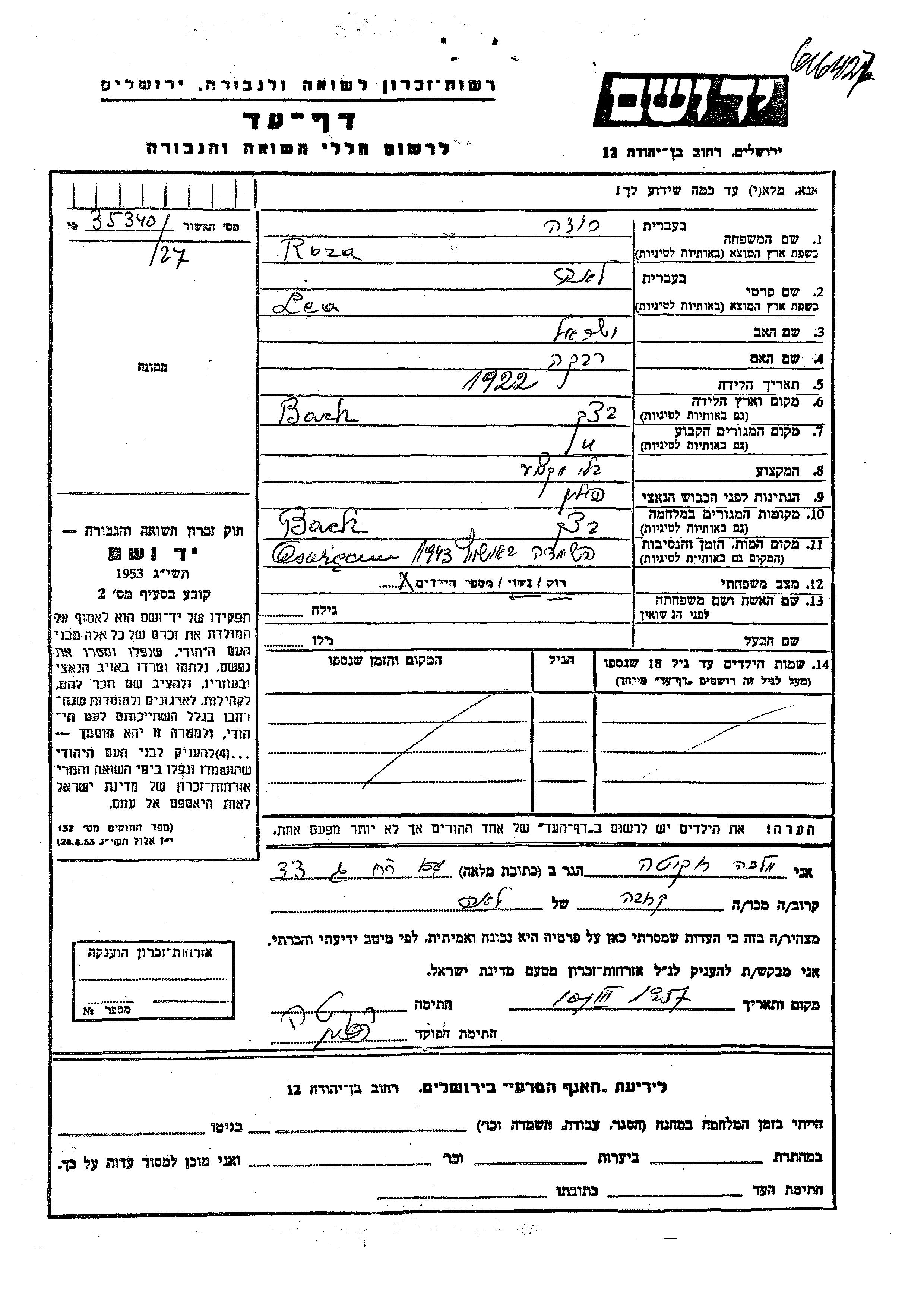 Lea Ruza was born in Baczki, Poland, 1922 to Yisrael and Rivka. Prior to WWII she lived in Baczki, Poland. During the war she was in Baczki, Poland. Lea was murdered in the Shoah. Place of death: Auschwitz, Poland, 1943.