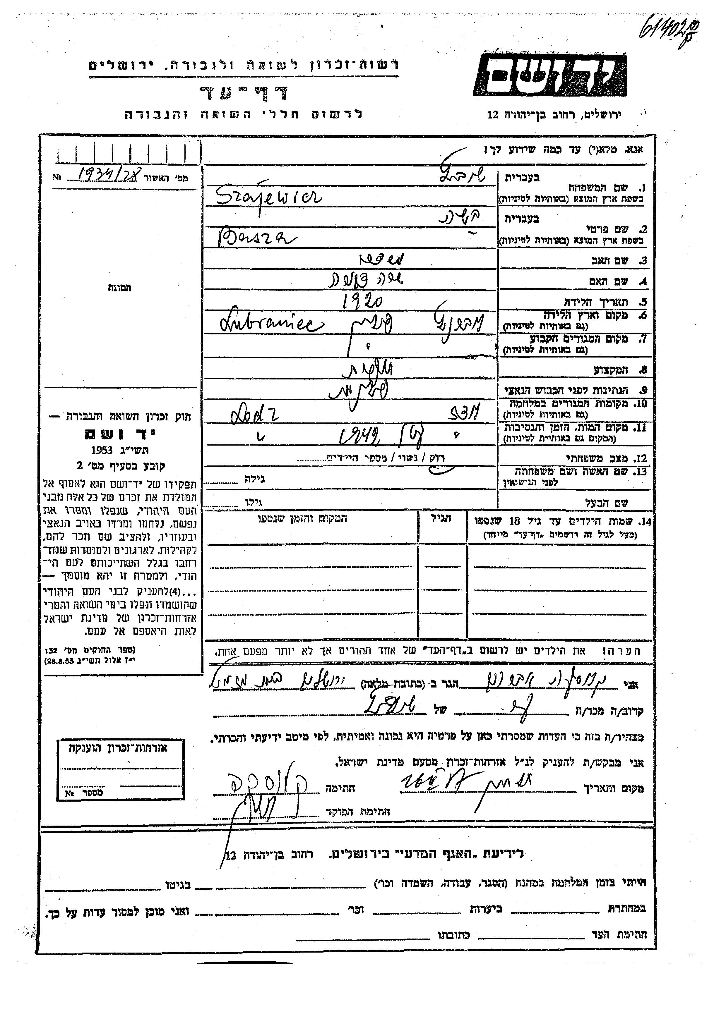 Basza Szajewicz was born in Lubraniec, Poland, 1920 to Mordekhai and Sara Dvora. She was a seamstress and single. Prior to WWII she lived in Lubraniec, Poland. During the war she was in Lodz, Poland. Basza was murdered in the Shoah. Place of death: Lodz, Poland, 1942.