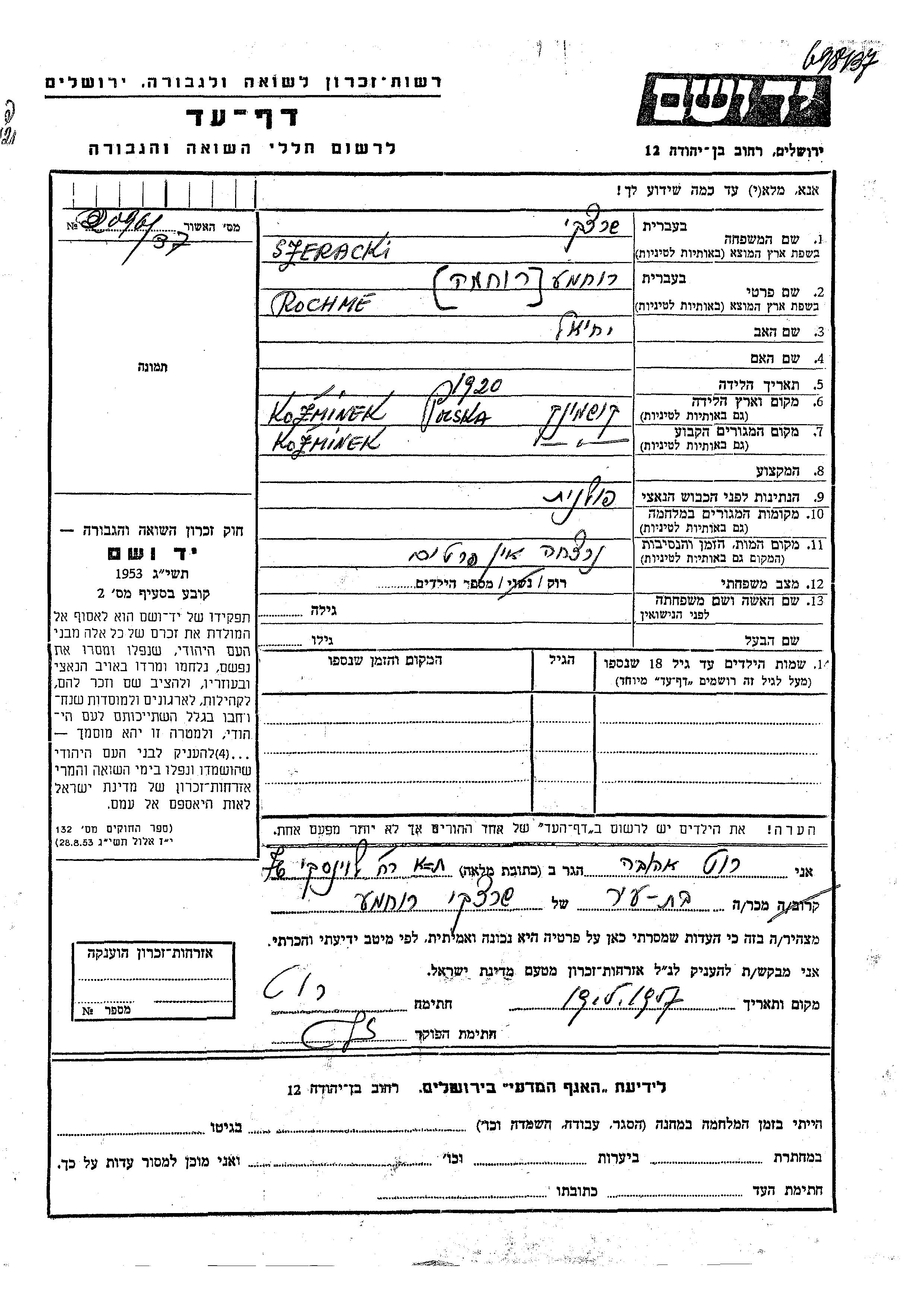 Szeracki Rochme 1920 Kozminek, Poland Page of Testimony