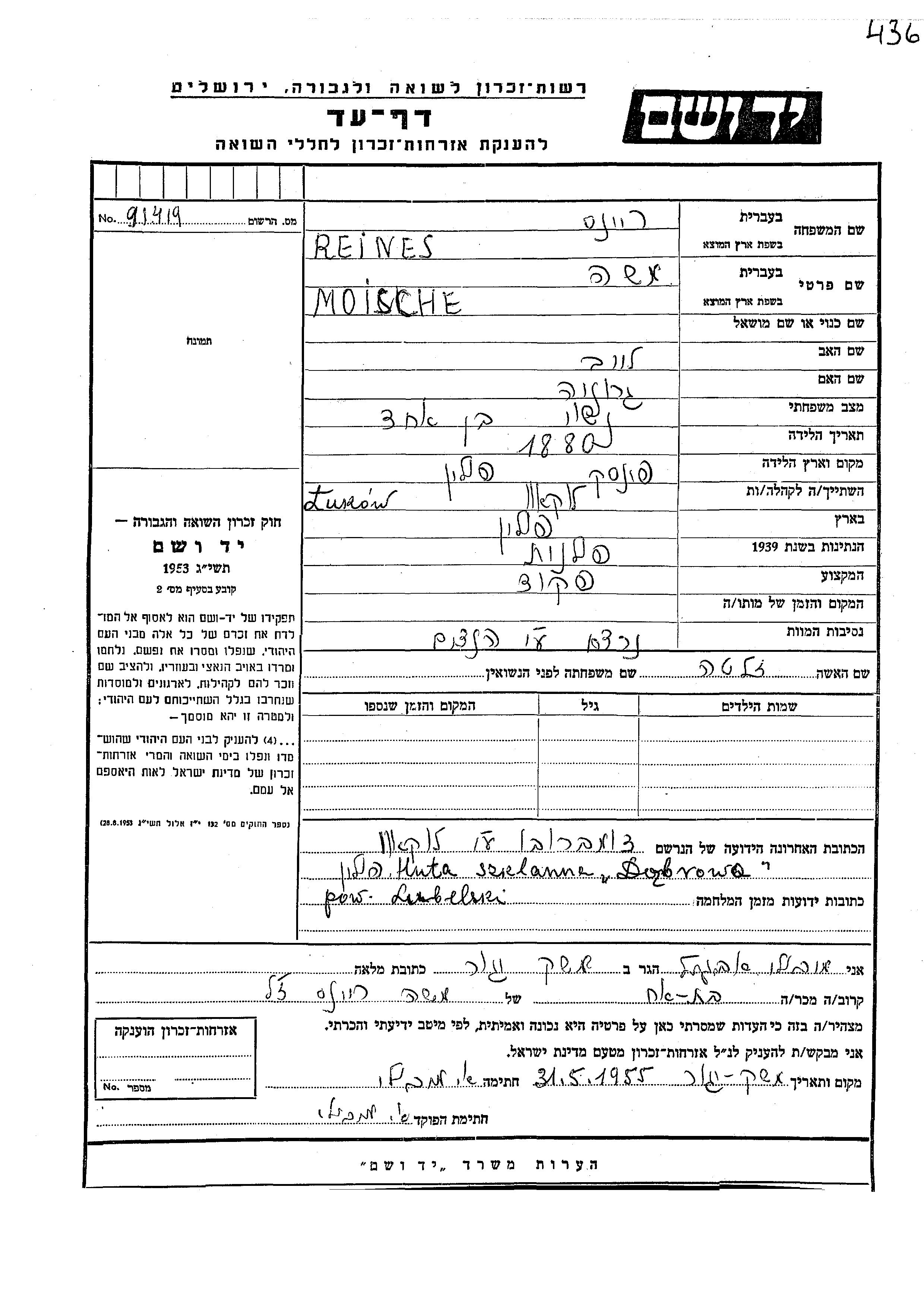 Moische Reines was born in Pinsk, Poland, 1880 to Leib and Grunia. He was a clerk and married to Zlata. Prior to WWII he lived in Lukow, Poland. During the war he was in Dąbrowa, Poland.