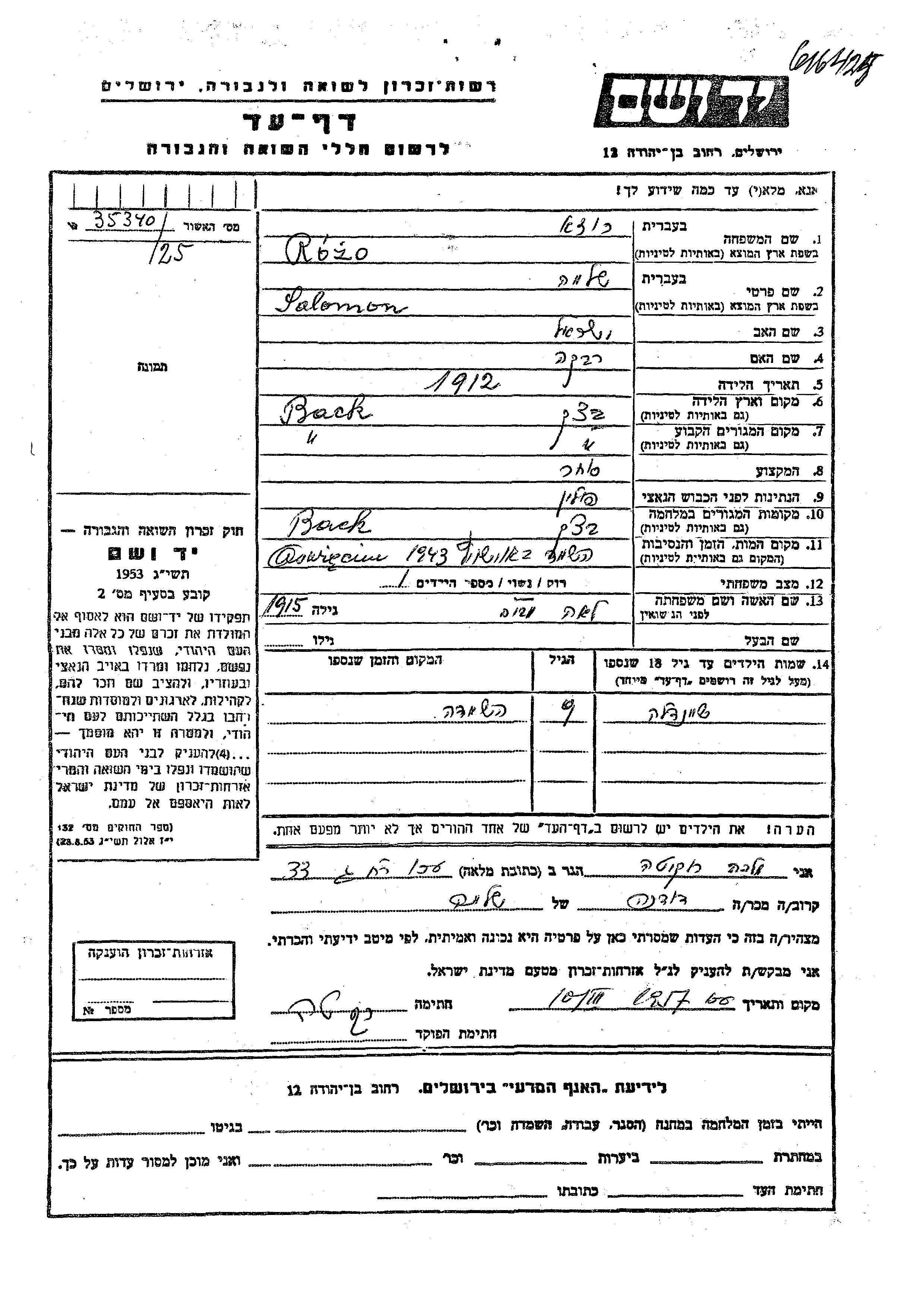 Salomon Rozo Roze was born in Baczki, Poland, 1912 to Yisrael and Rivka. He was a merchant and married to Lea. Prior to WWII he lived in Baczki, Poland. During the war he was in Baczki, Poland. Salomon was murdered in the Shoah. Place of death: Auschwitz, Poland, 1943.