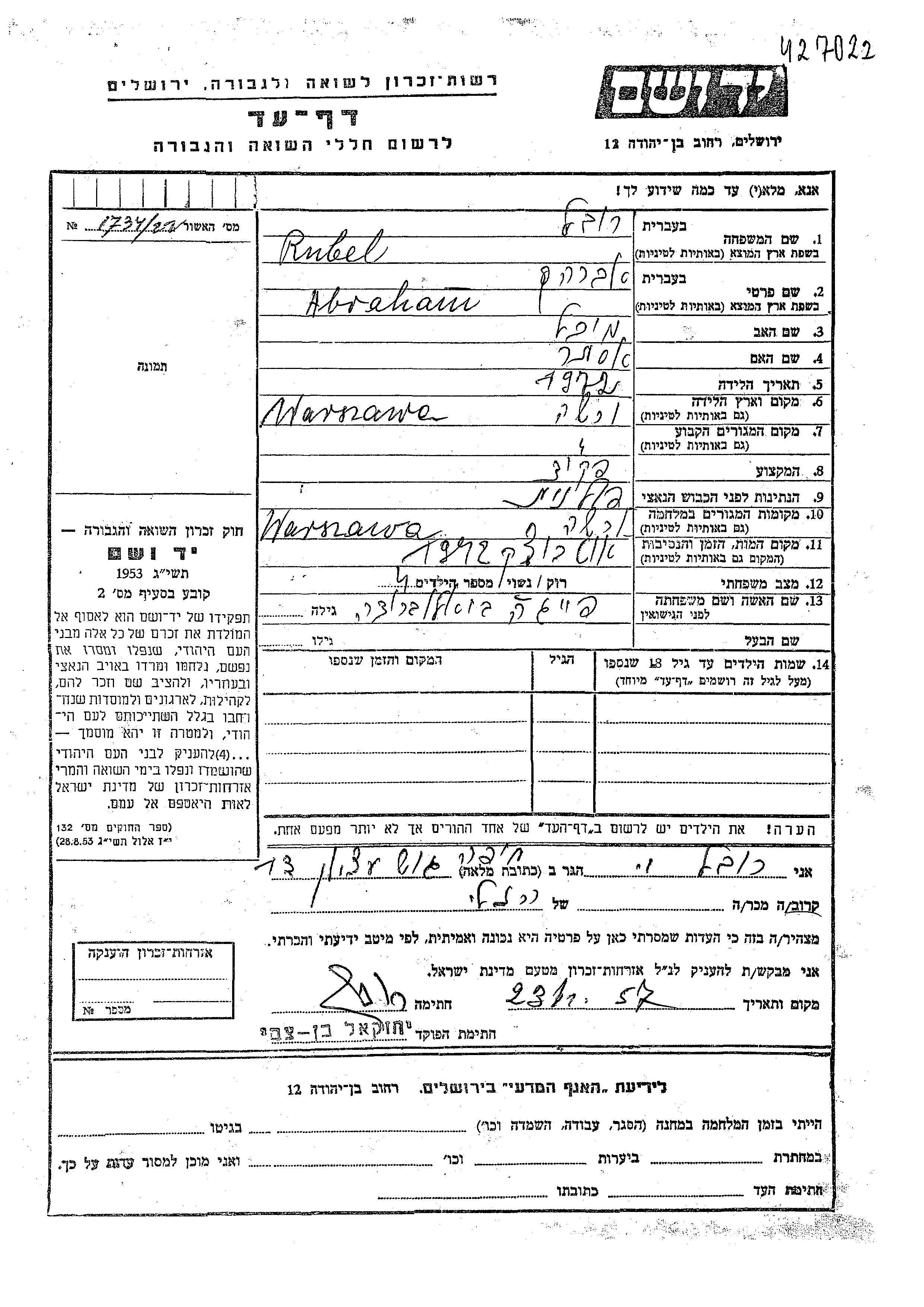 Abraham Rubel was born in Warsaw, Poland, 1922 to Mikhel and Ester. He was a clerk and married to Feiga nee Bialobrode. Prior to WWII he lived in Warsaw, Poland. During the war he was in Warsaw, Poland. Abraham was murdered in the Shoah. Place of death: Auschwitz, Poland, 1942.