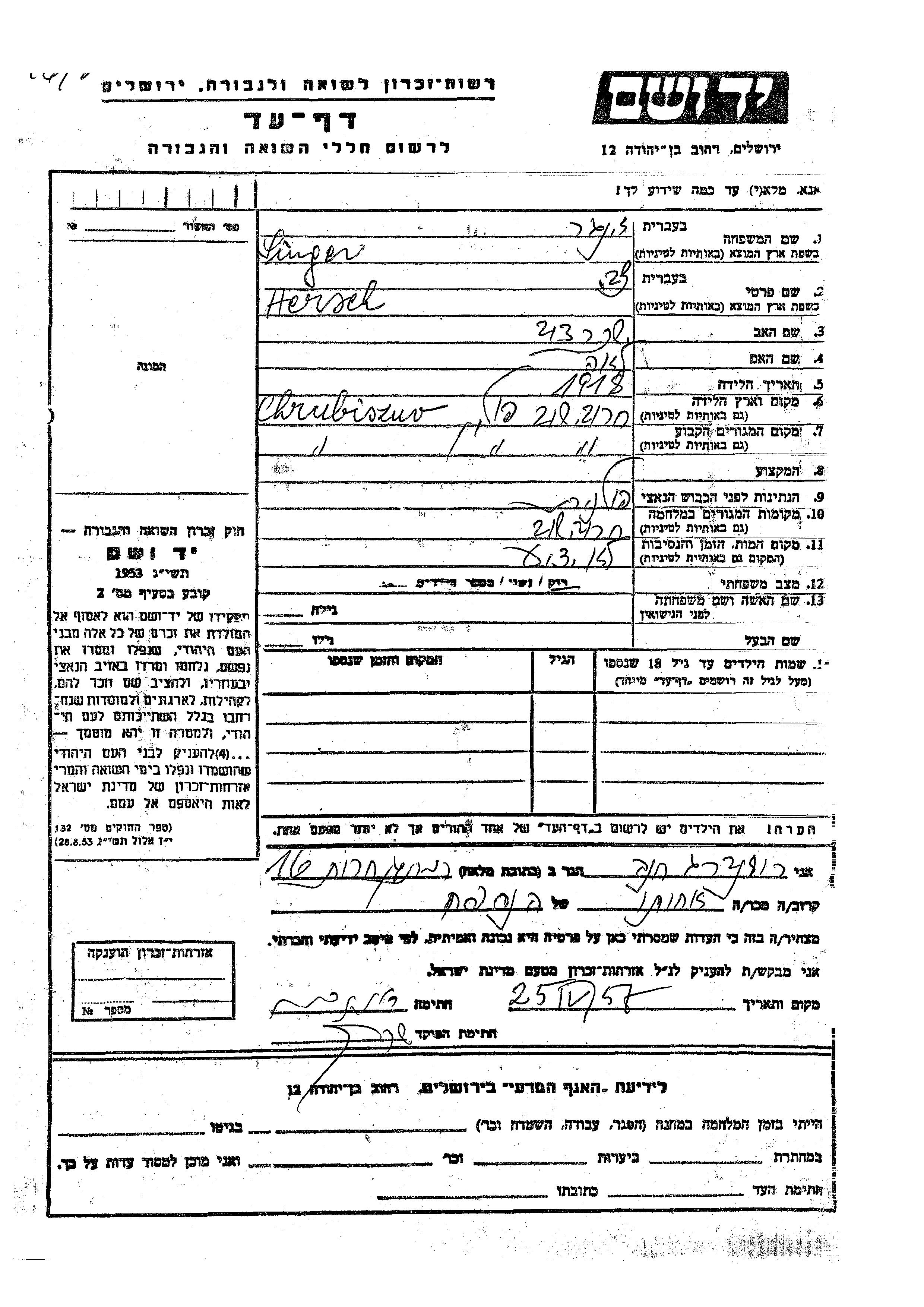 Hersel Tzvi Zinger was born in Hrubieszow, Poland, 1918 to Shner Dov and Lea. He was single. Prior to WWII he lived in Hrubieszow, Poland. During the war he was in Hrubieszow, Poland. Hersel Tzvi was murdered in the Shoah.