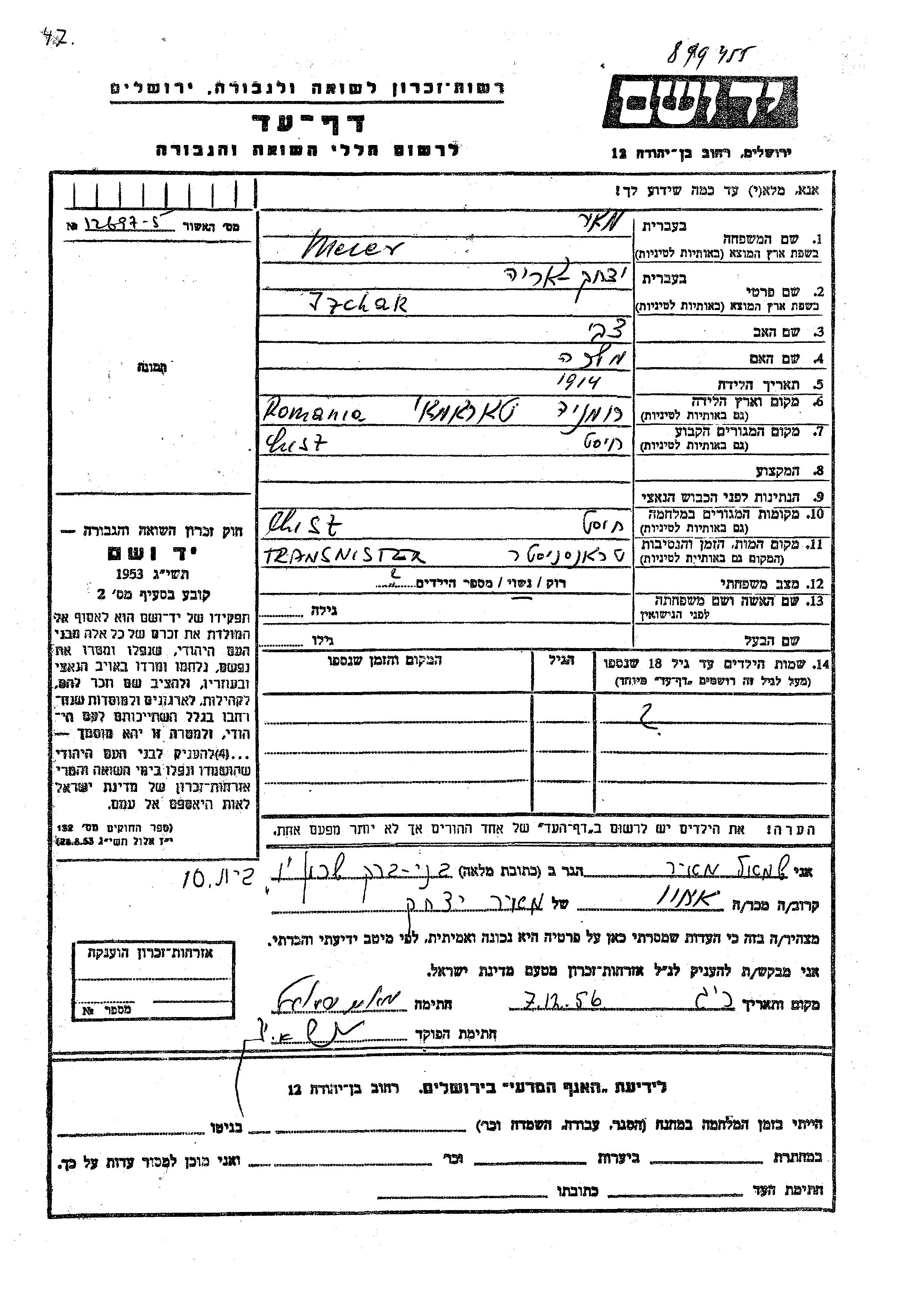 Izchak Arie Meier was born in Tarnaveni, Romania, 1914 to Tzvi and Malka. He was married. Prior to WWII he lived in Chist, Czechoslovakia. During the war he was in Chist, Czechoslovakia. Izchak Arie was murdered in the Shoah. Place of death: Transnistria, Ukraine (USSR).