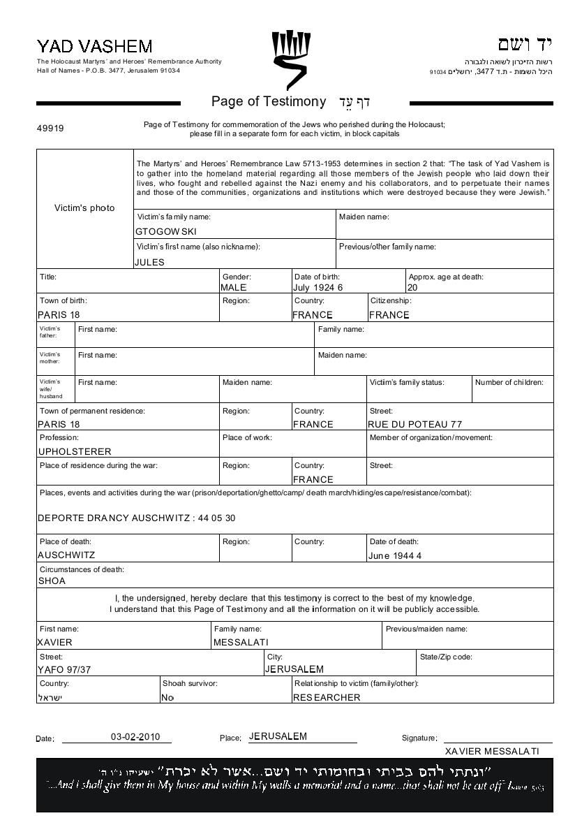 Jules Gtogowski was born in Paris, France, 1924. He was an upholsterer and single. Prior to WWII he lived in Paris, France. During the war he was in Paris, France. Jules was murdered in the Shoah. Place of death: Auschwitz, Poland, 04/06/1944.