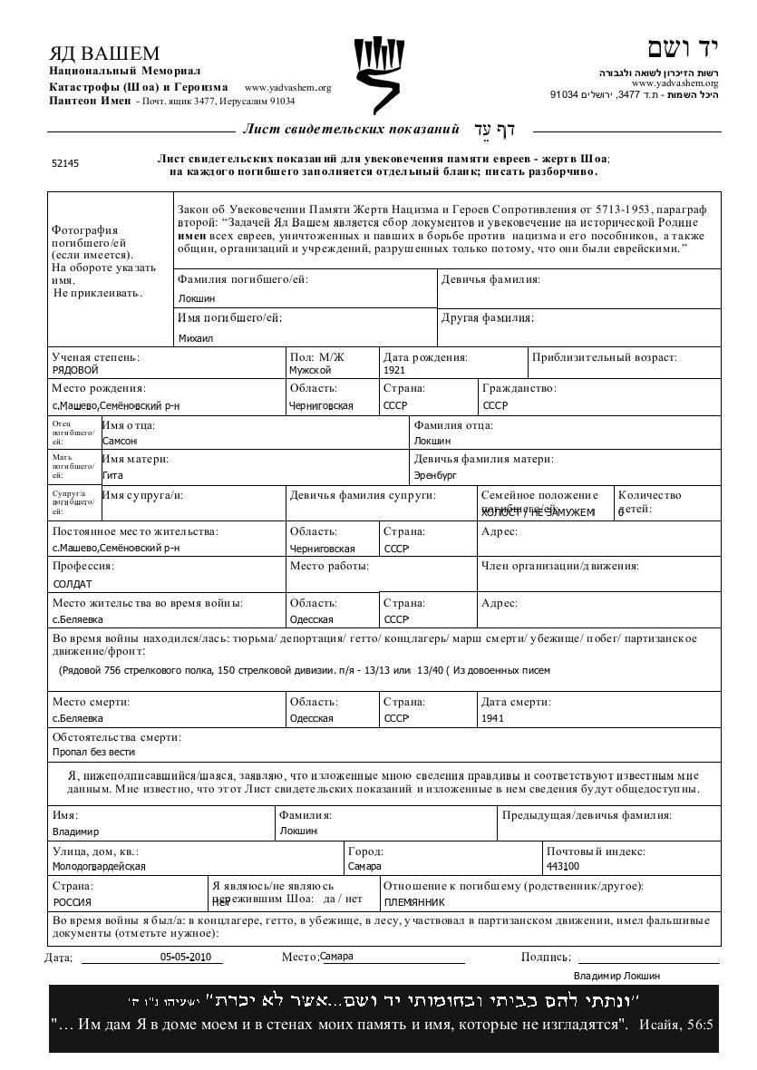 Private Mikhail Lokshin was born in Mashevo, Ukraine (USSR), 1921 to Samson and Gita nee Erenburg. He was a soldier and single. Prior to WWII he lived in Mashevo, Ukraine (USSR). During the war he was in the Soviet armed forces. Private Lokshin was murdered in the Shoah. Place of death: Belyayevka, Ukraine (USSR), 1941.