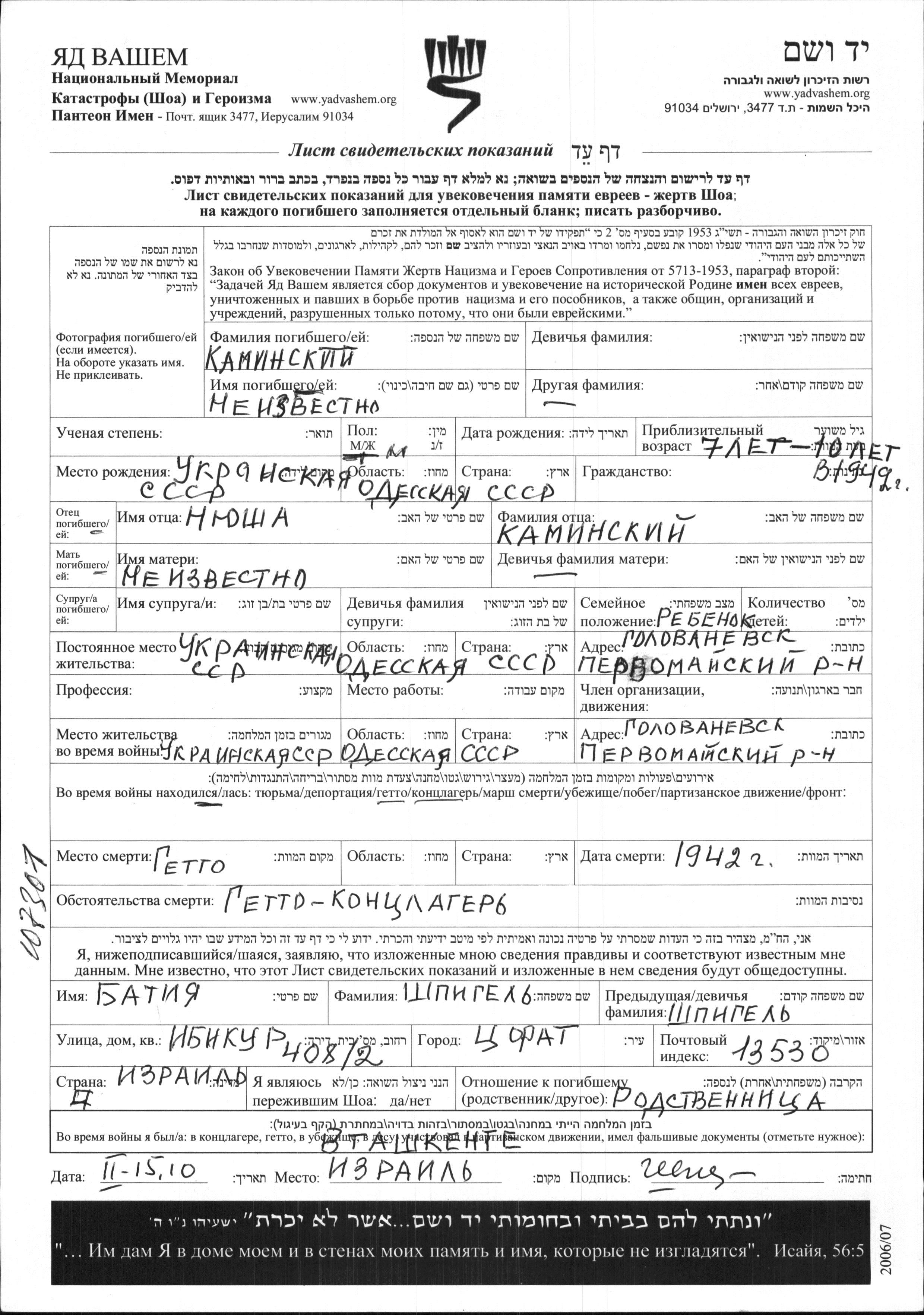 Kaminskiy First name unknown Golovanevsk, Ukraine (USSR) Page of Testimony