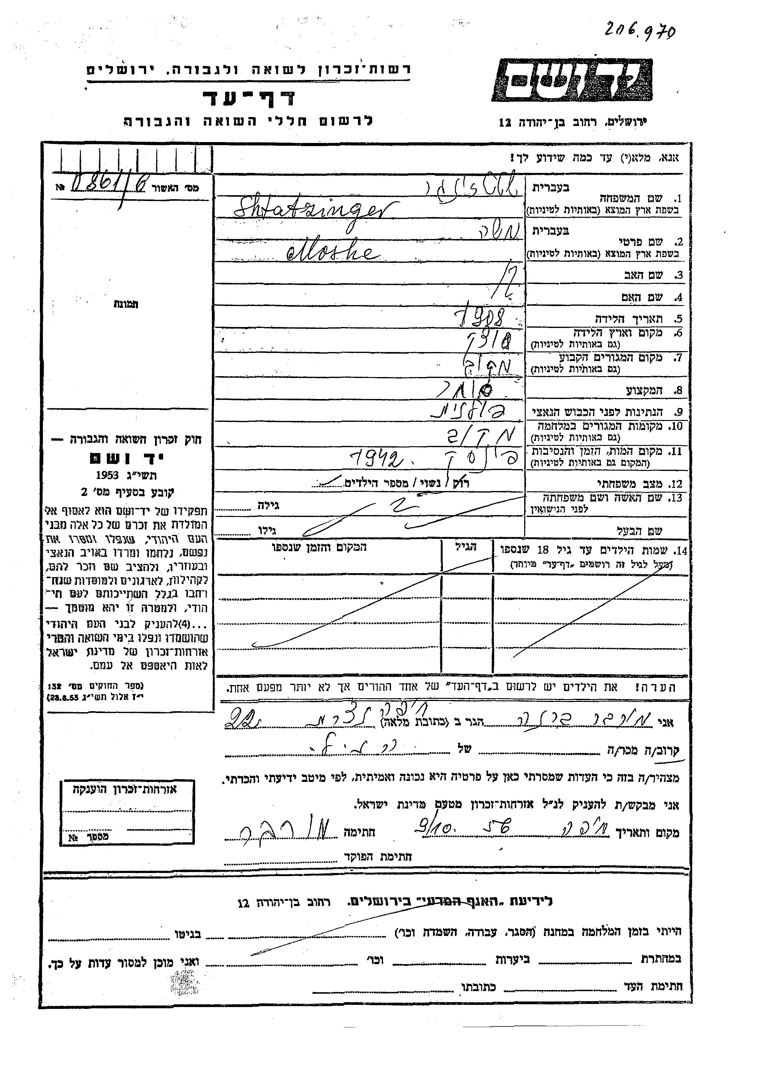 Moshe Shtatzinger was born in Sutsk, Poland, 1908. He was a merchant and single. Prior to WWII he lived in Makow Mazowiecki, Poland. During the war he was in Makow Mazowiecki, Poland. Moshe was murdered in the Shoah. Place of death: Pinsk, Poland, 1942.