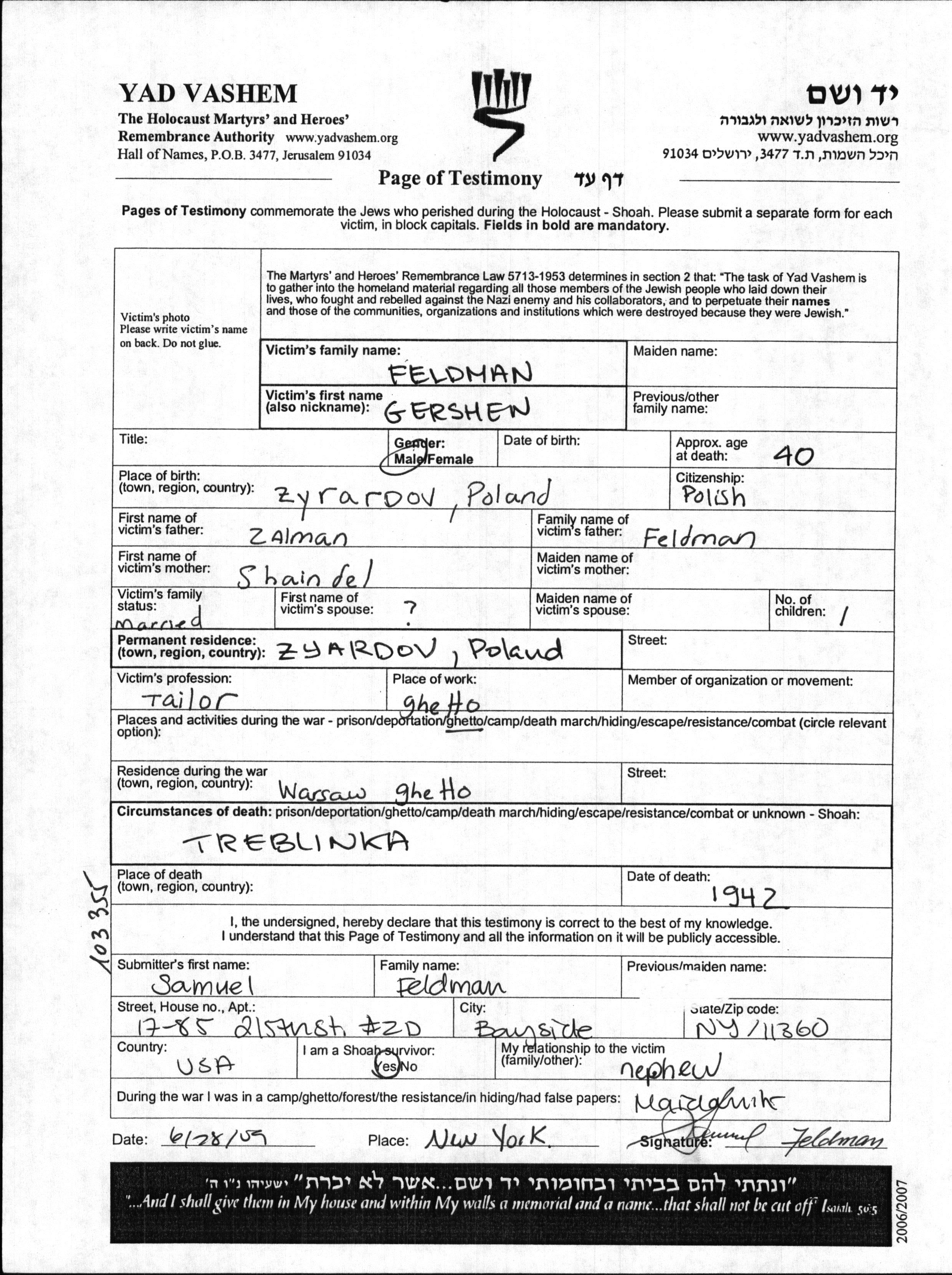 Gershen Feldman was born in Zyrardow, Poland to Zalman and Shaindel. He was a tailor and married. Prior to WWII he lived in Zyrardow, Poland. During the war he was in Warszawa, Poland. Gershen was murdered in the Shoah. Place of death: Treblinka, Poland, 1942.