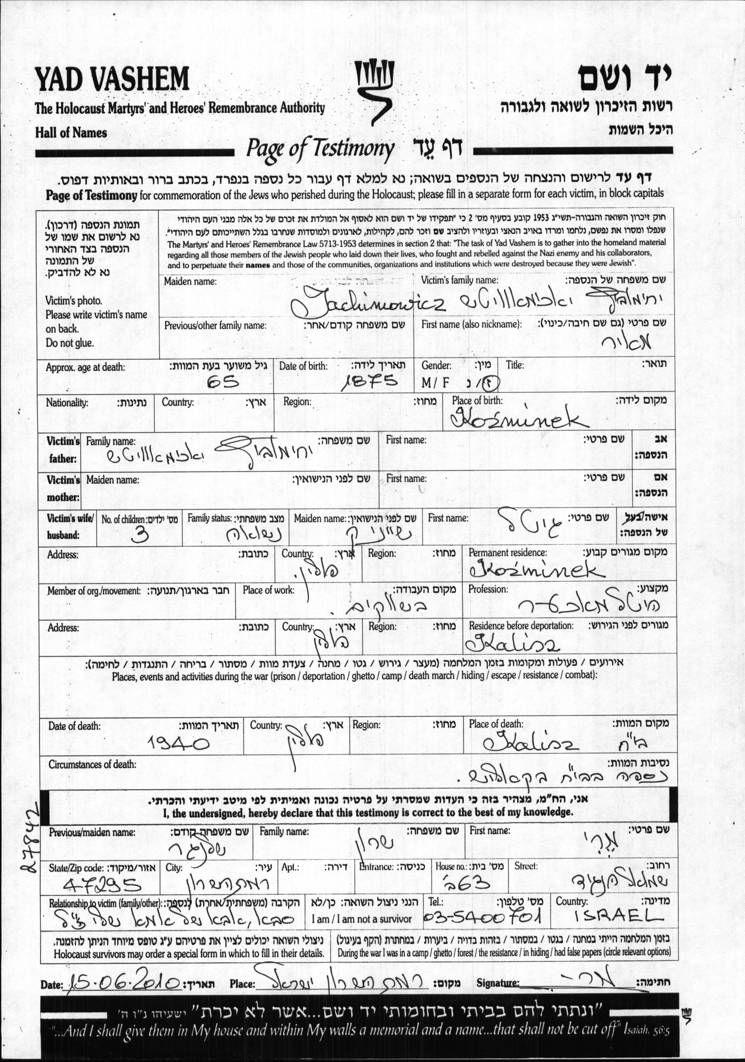 Meir Jachimowicz was born in Kozminek, Poland, 1875. He was a hatter and married to Gitel nee Sheinik. Prior to WWII he lived in Kozminek, Poland. During the war he was in Kalisz, Poland. Meir was murdered in the Shoah. Place of death: Kalisz, Poland, 1940.