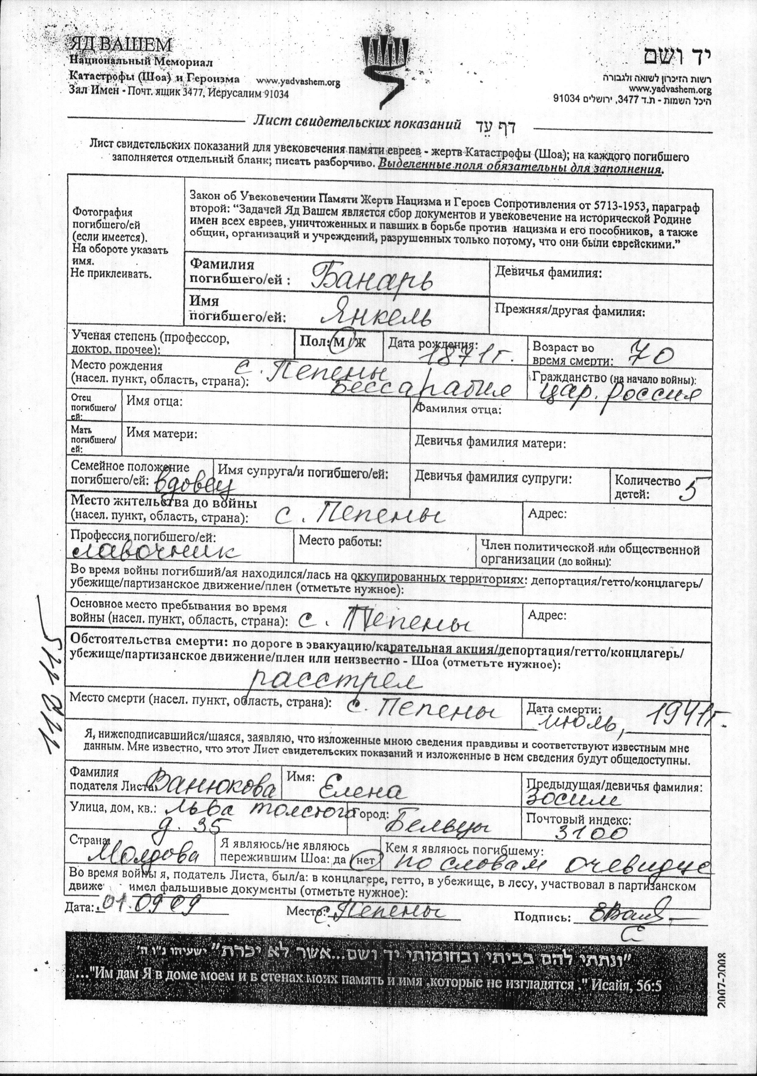 Yankel Banar was born in Pepeni, Romania, 1871. He was a grocery owner and a widower. Prior to WWII he lived in Pepeni, Romania. During the war he was in Pepeni, Romania. Yankel was murdered in the Shoah. Place of death: Pepeni, Romania, 07/1941.