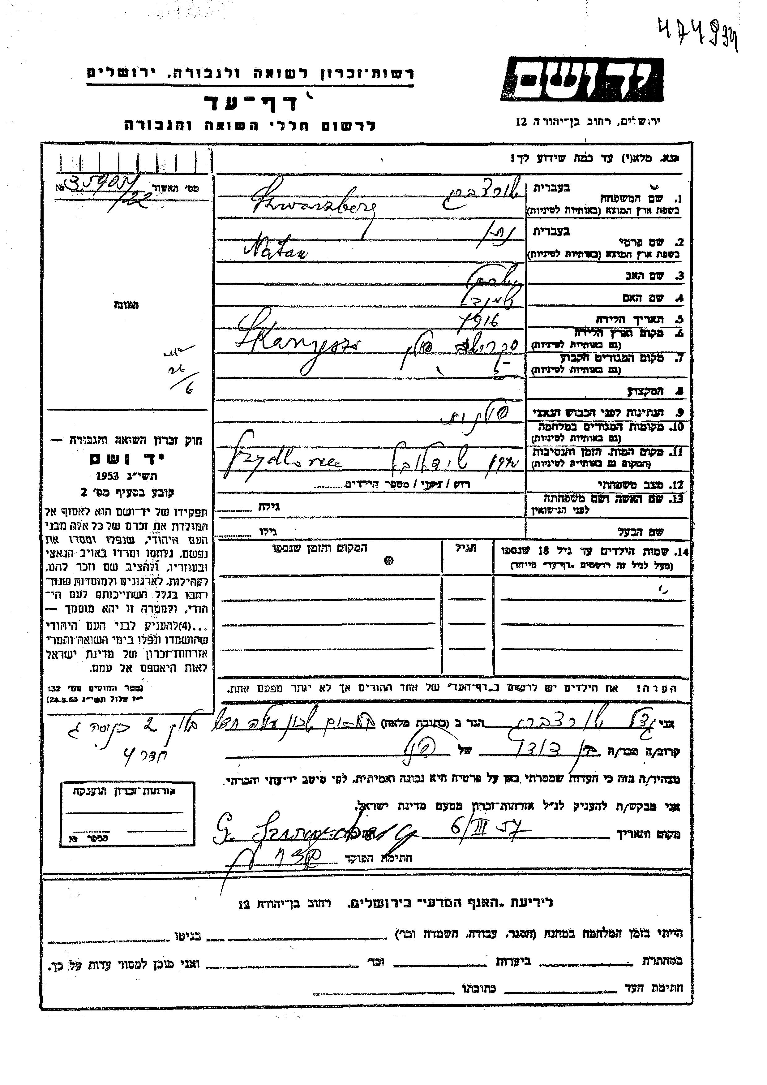 Natan Szwarzberg was born in Skaryszew, Poland, 1916 to Yisrael and Sheindl. He was single. Prior to WWII he lived in Skaryszew, Poland. Natan was murdered in the Shoah. Place of death: Szydlowiec, Poland, 1942.