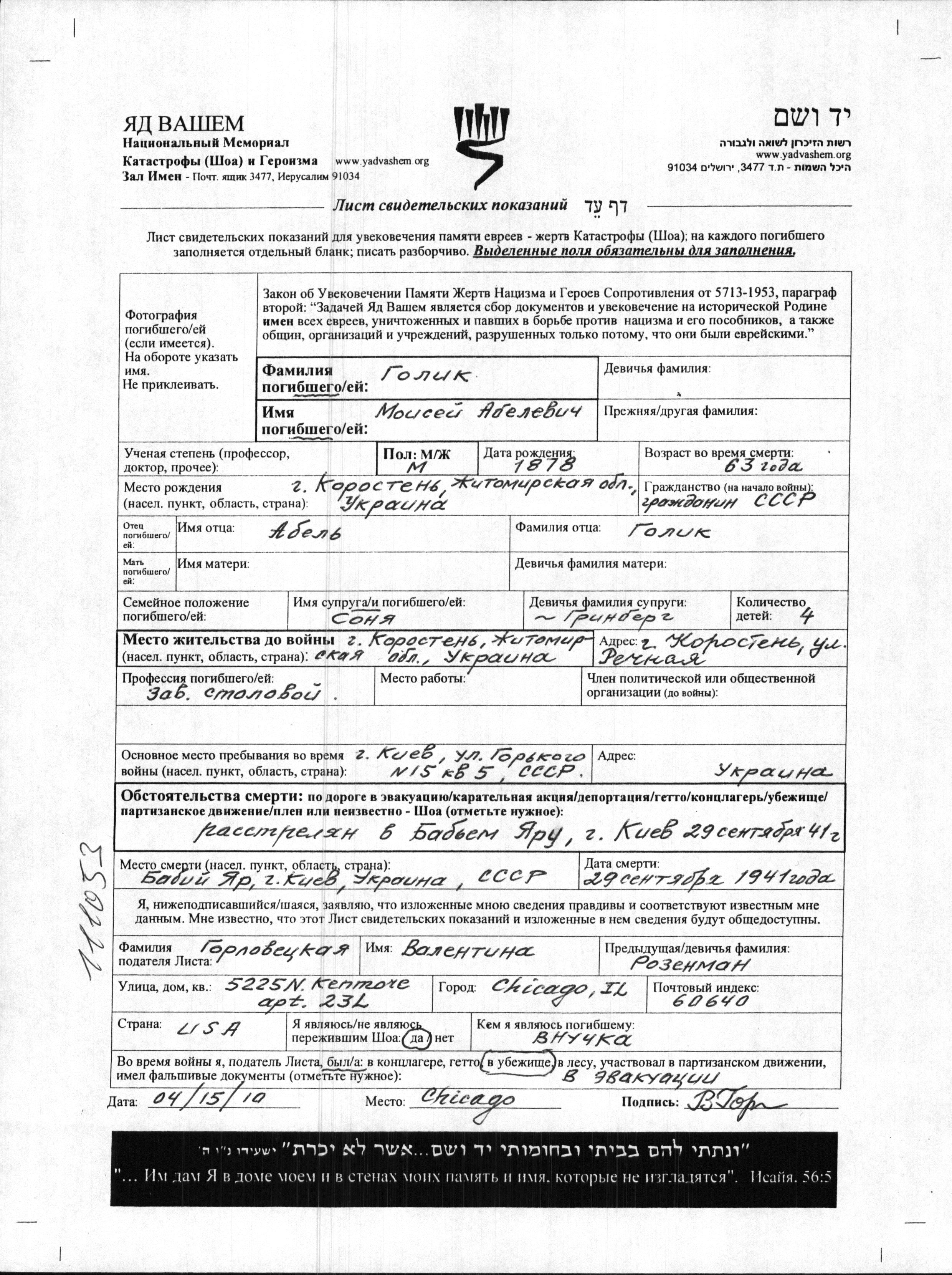 Golik Moisey 1878 Korosten, Ukraine (USSR) Page of Testimony