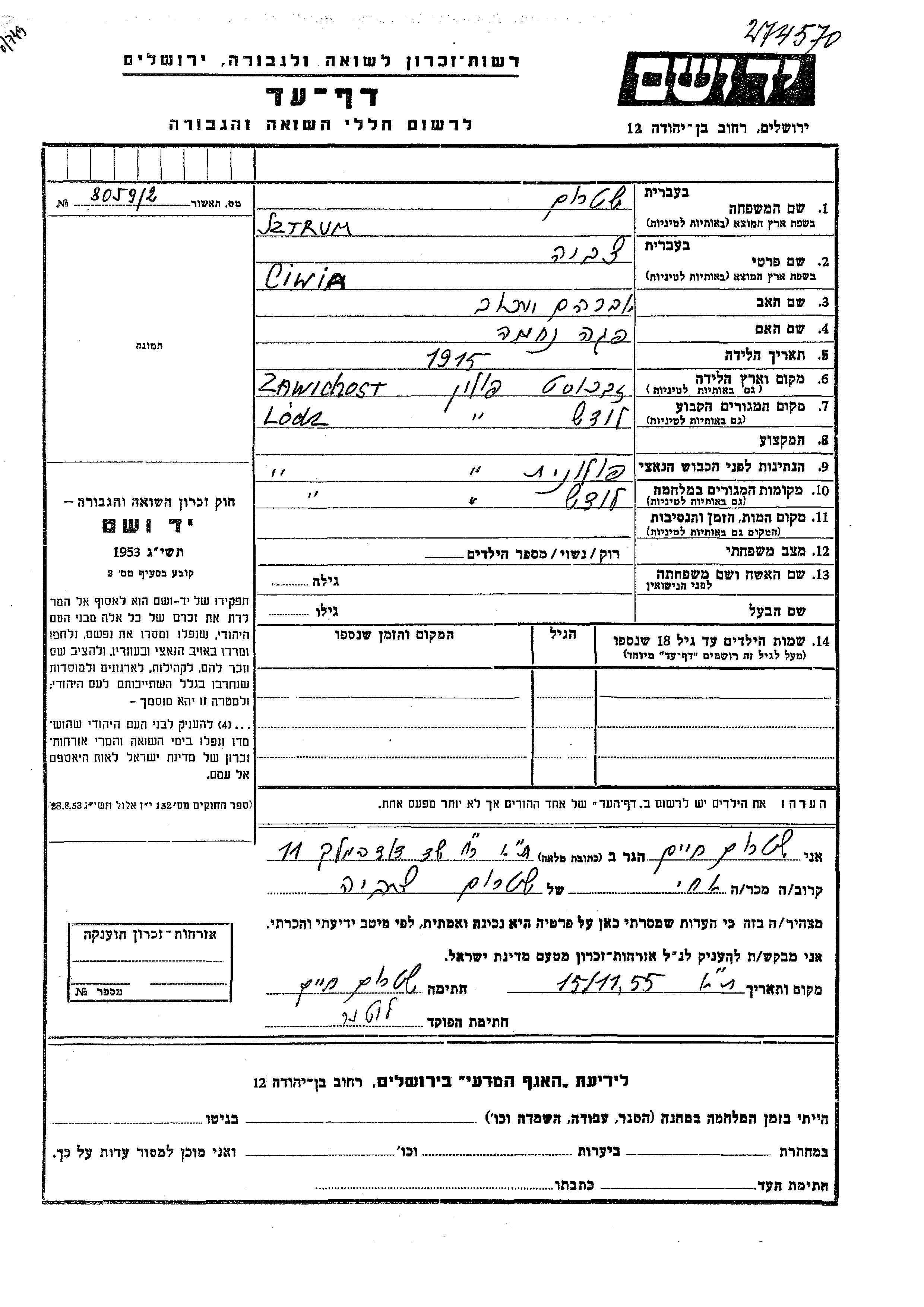 Ciwia Sztrum was born in Zawichost, Poland, 1915 to Avraham Yakov and Fega Nekhama. Prior to WWII she lived in Lodz, Poland. During the war she was in Lodz, Poland. Ciwia was murdered in the Shoah.