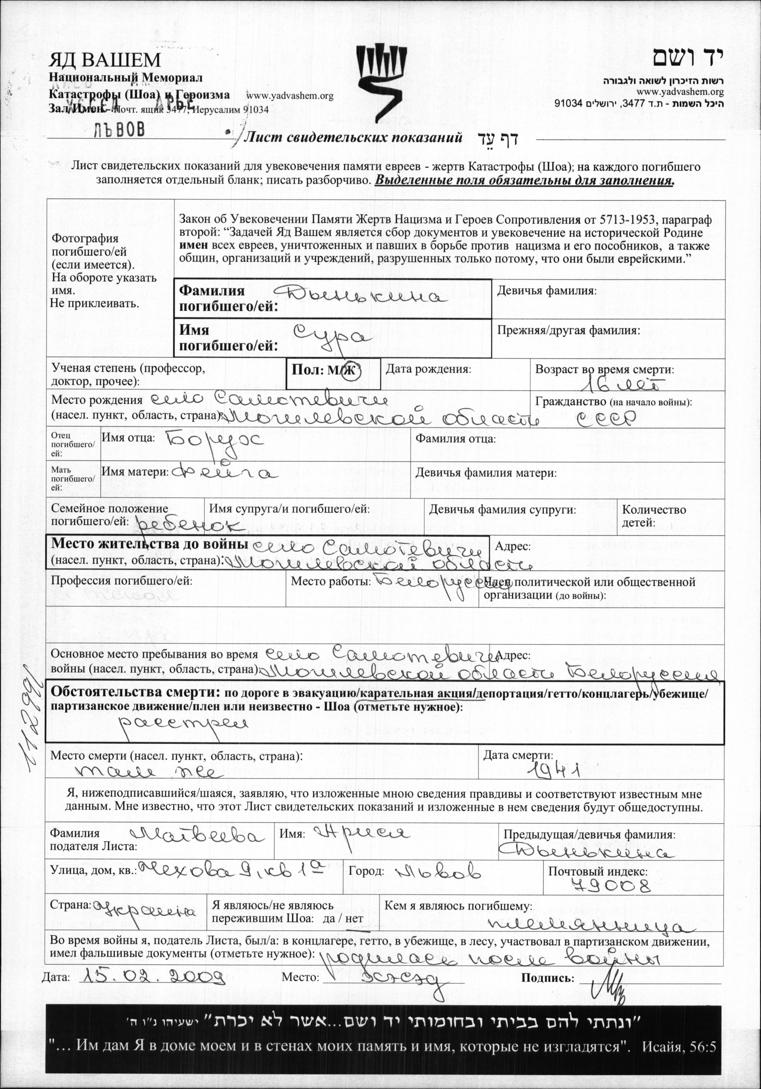 Dynkina Sura Samotevichi, Belorussia (USSR) Page of Testimony