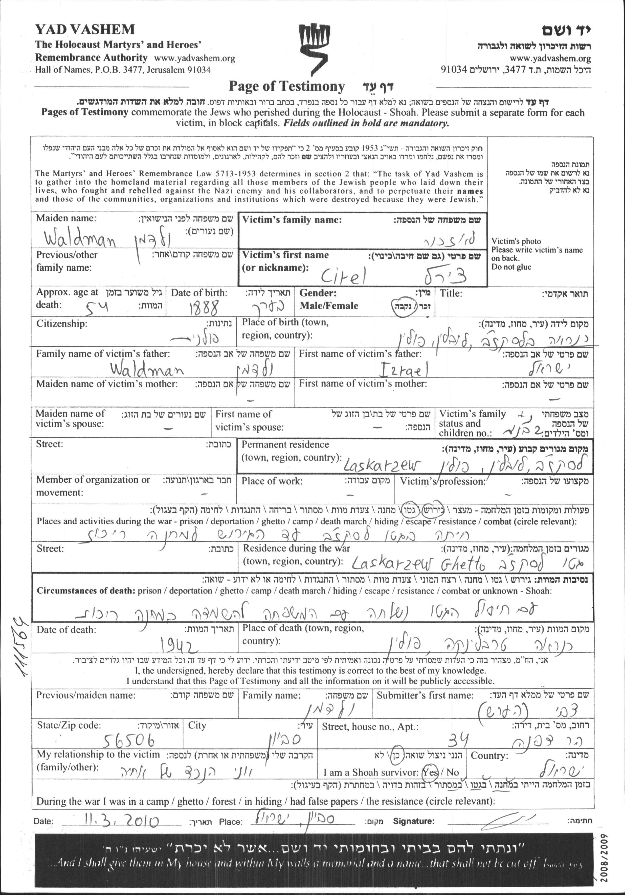 Tzirel Surname unknown nee Valdman was born in Laskarzew, Poland, 1888 to Yisrael. She was married. Prior to WWII she lived in Laskarzew, Poland. During the war she was in Laskarzew, Poland. Tzirel was murdered in the Shoah. Place of death: Treblinka, Poland, 1942.