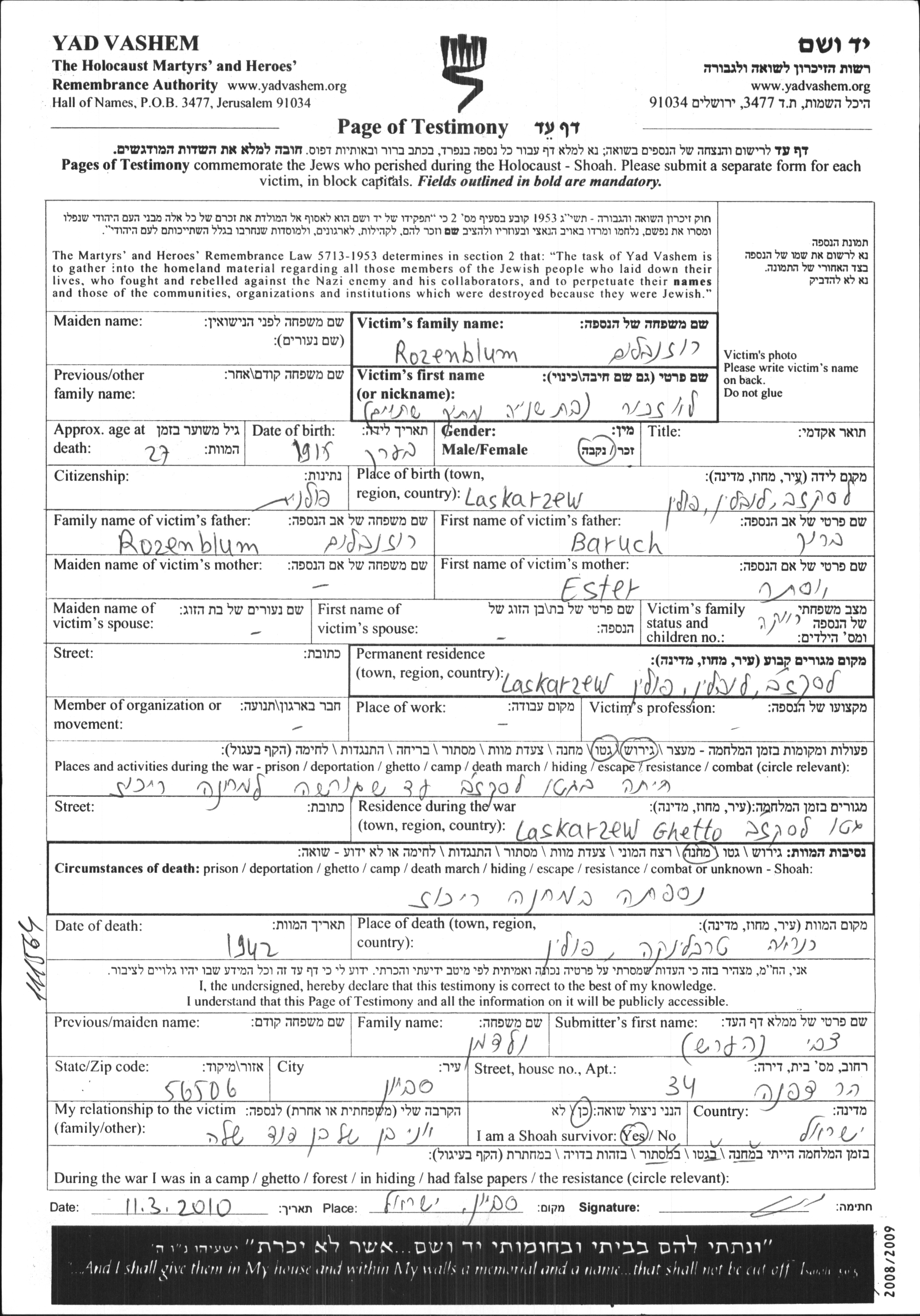 First name unknown Rozenblum was born in Laskarzew, Poland, 1915 to Baruch and Ester. She was single. Prior to WWII she lived in Laskarzew, Poland. During the war she was in Laskarzew, Poland. She was murdered in the Shoah. Place of death: Treblinka, Poland, 1942.