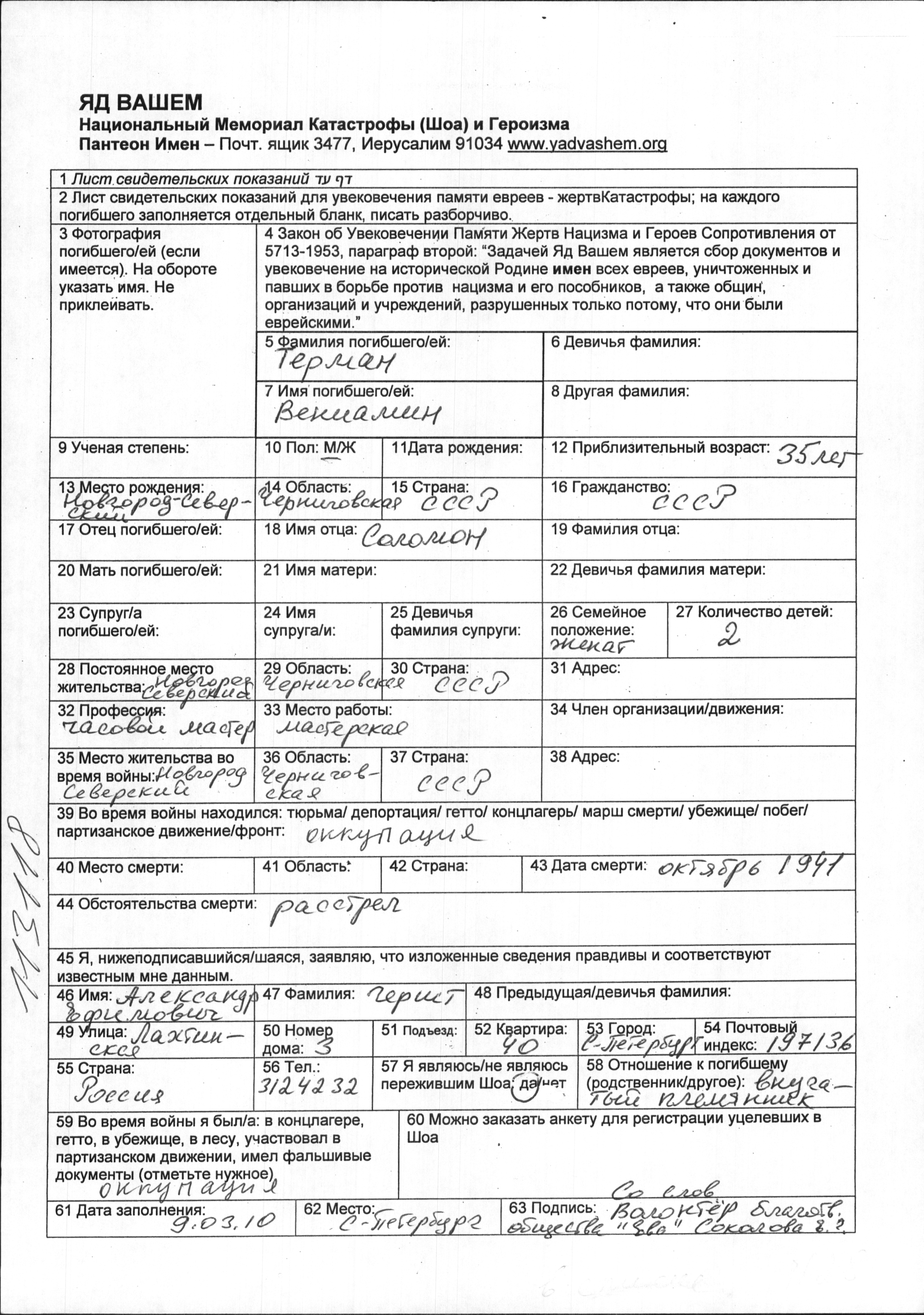 Veniamin German was born in Novgorod Severskiy, Ukraine (USSR) to Solomon. He was a watchmaker and married. Prior to WWII he lived in Novgorod Severskiy, Ukraine (USSR). During the war he was in Novgorod Severskiy, Ukraine (USSR). Veniamin was murdered in the Shoah. Place of death: unknown, 10/1941.
