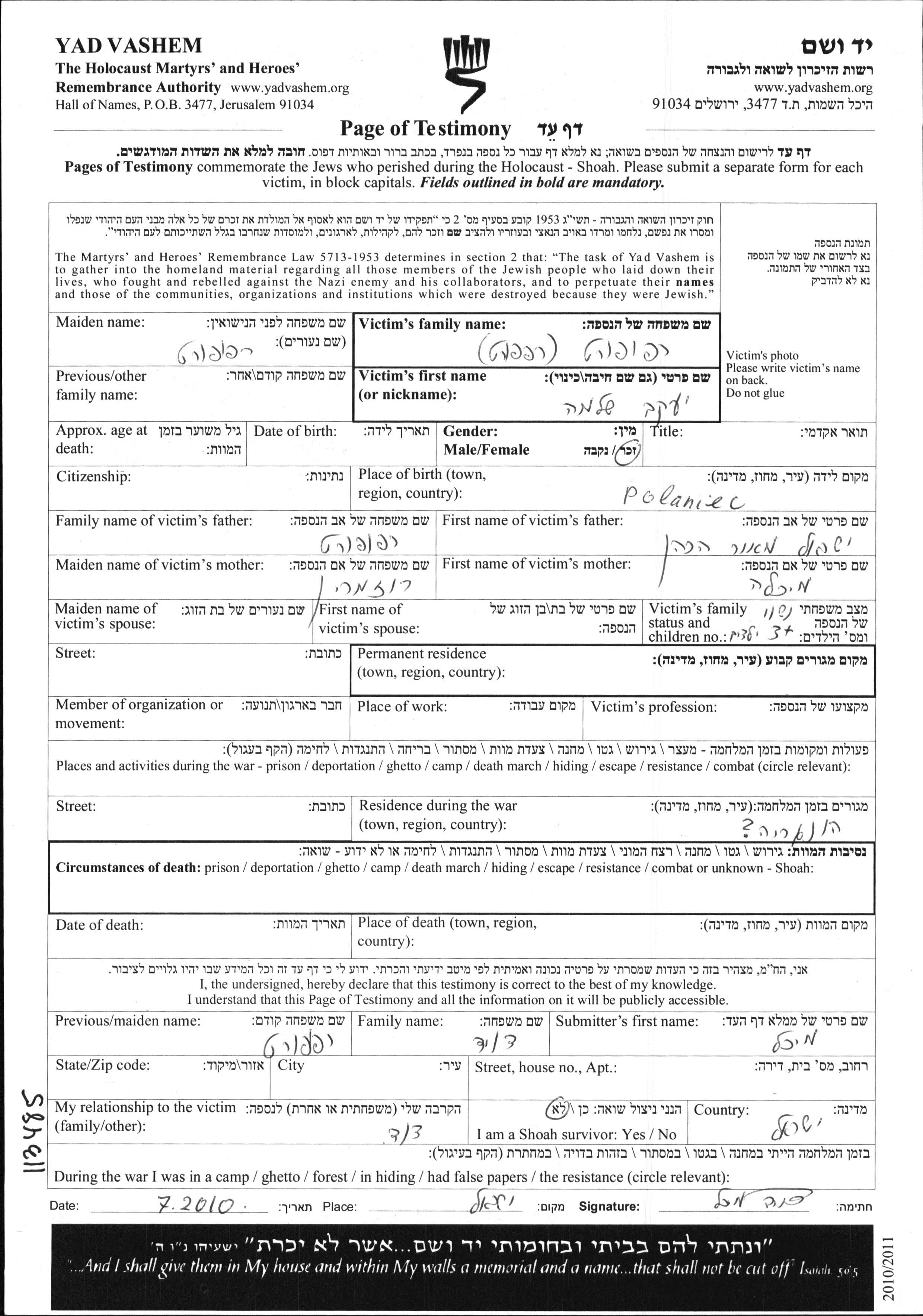 Yaakov Shlomo Rapoport was born in Polaniec, Poland to Yisrael Meir and Mikhla nee Rozmarin. He was married. Prior to WWII he lived in Poland. During the war he was in Hungary. Yaakov Shlomo was murdered in the Shoah.