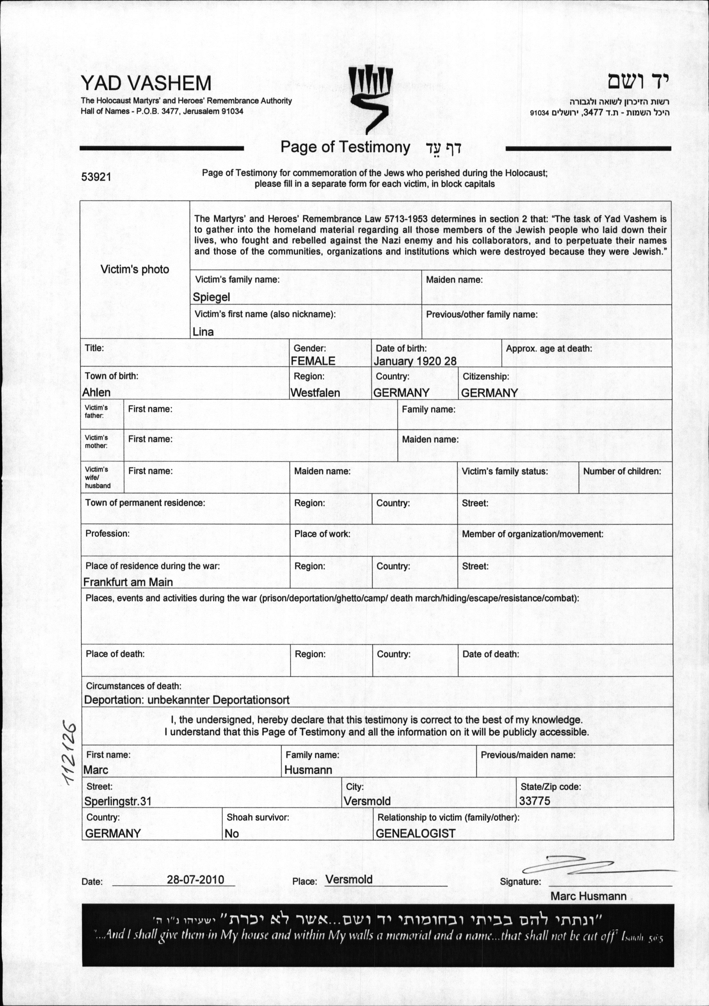 Lina Spiegel was born in Ahlen, Germany, 1920. She was single. Prior to WWII she lived in Germany. During the war she was in Frankfurt am Main, Germany. Lina was murdered in the Shoah.