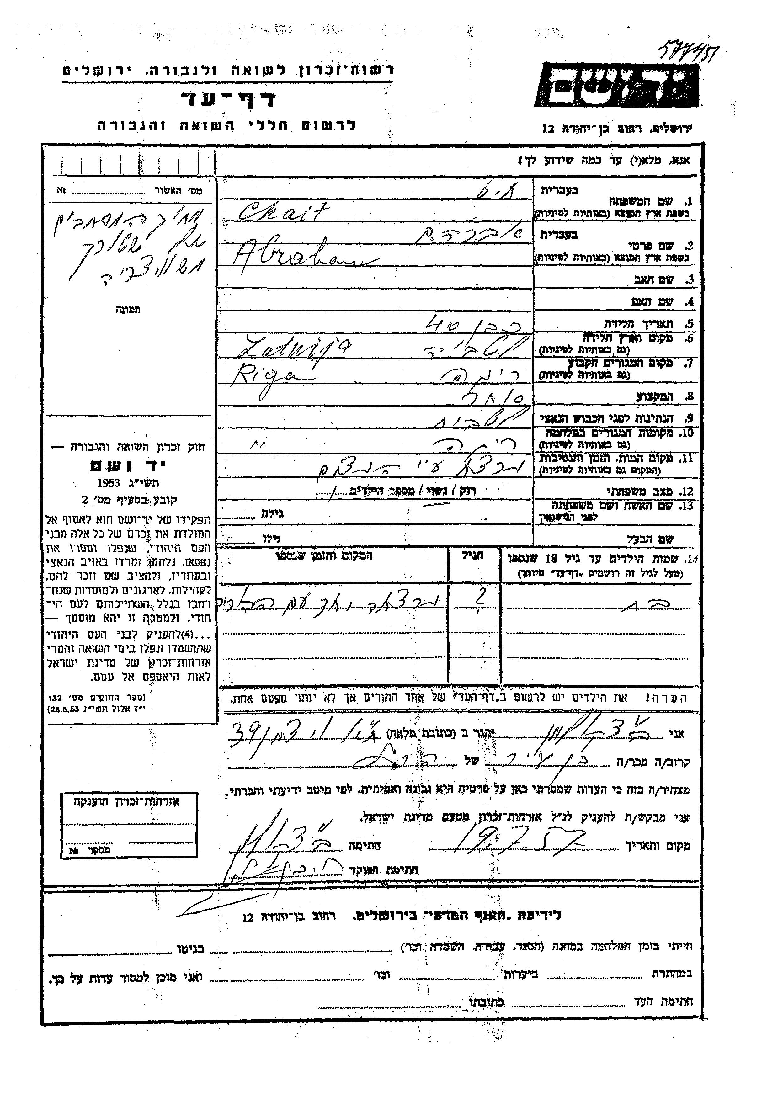 Abraham Chait was born in Latvia. He was a merchant and married. Prior to WWII he lived in Riga, Latvia. During the war he was in Riga, Latvia.