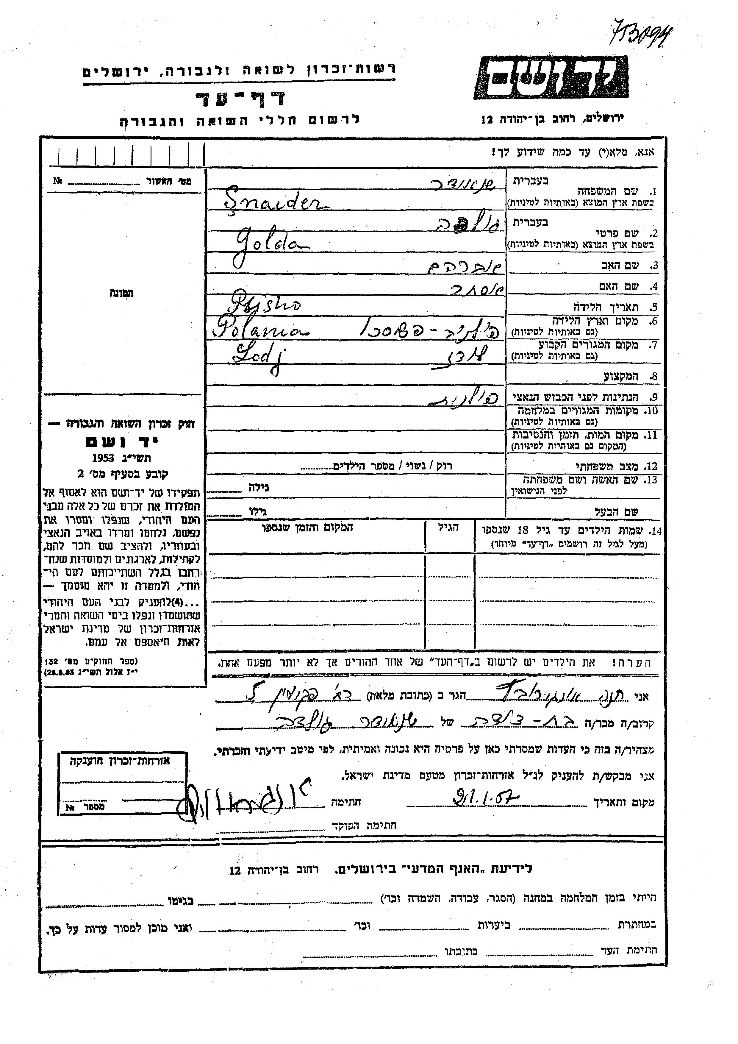 Snaider Golda Lodz, Poland Page of Testimony