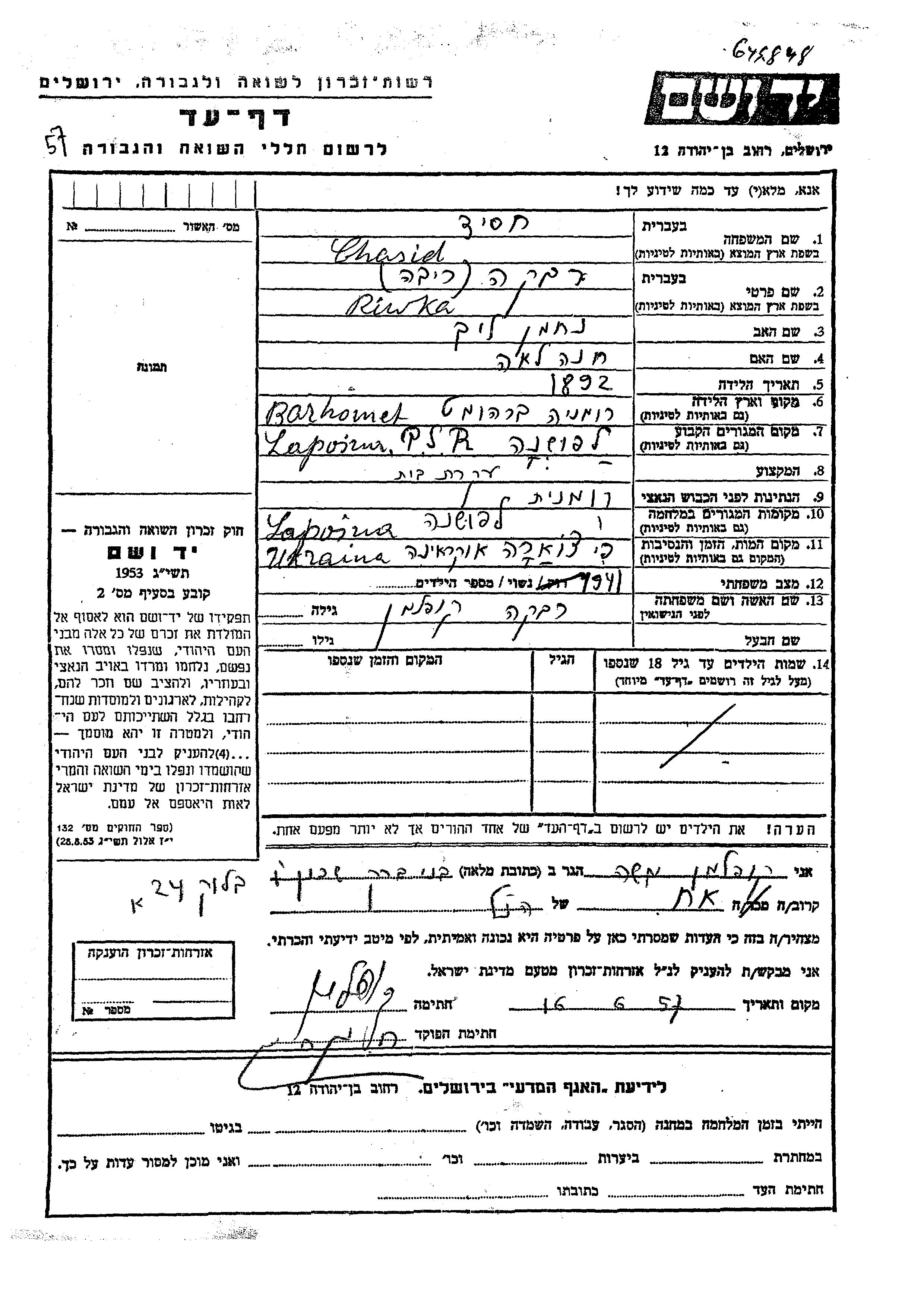 Chasid Riwka 1892 Lapusna, Romania Page of Testimony