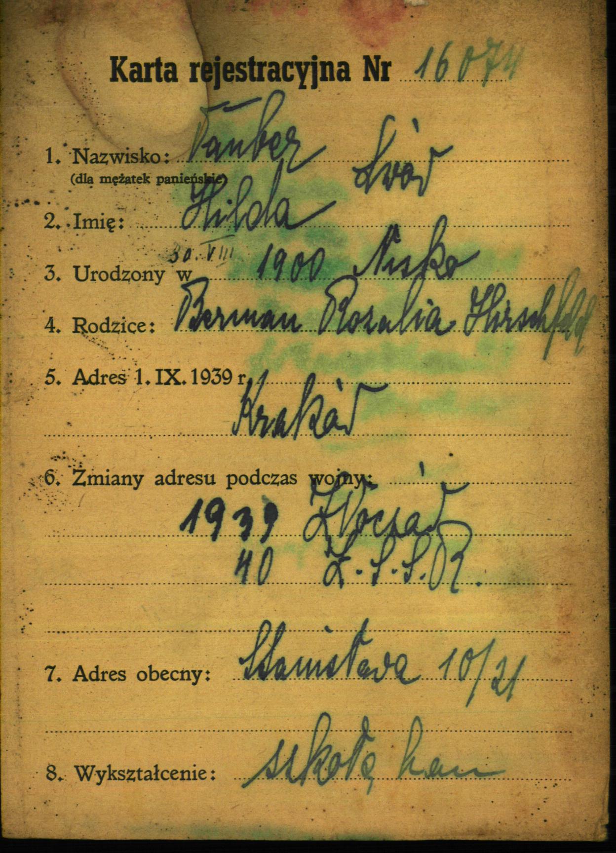 Hilda Tauber was born in Nisko, Poland, 1900 to Berman and Rozalia. She was a housewife. Prior to WWII she lived in Krakow, Poland. During the war she was in Soviet Union. Hilda survived the Shoah.