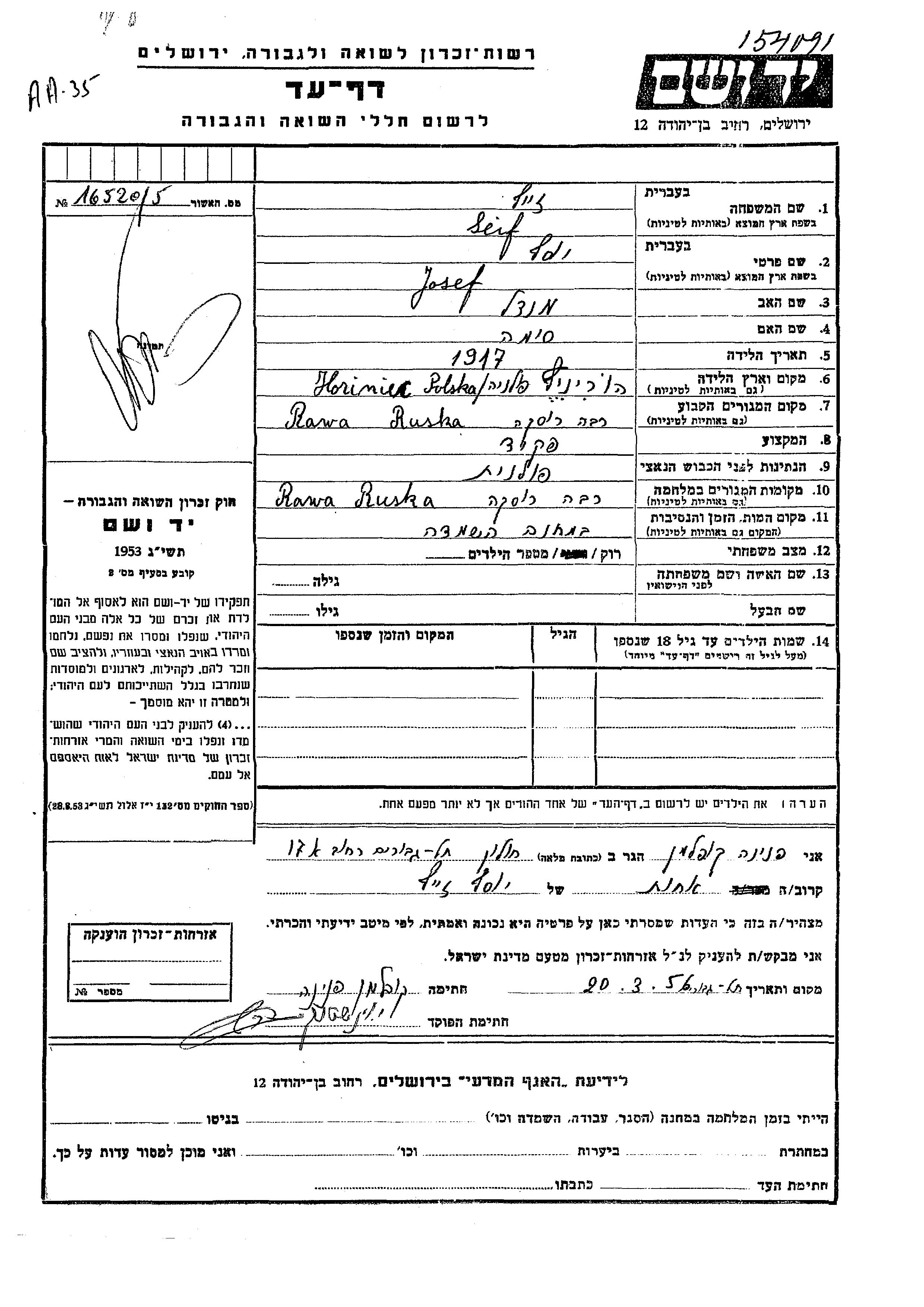 Seif Josef 1917 Rawa Ruska, Poland Page of Testimony