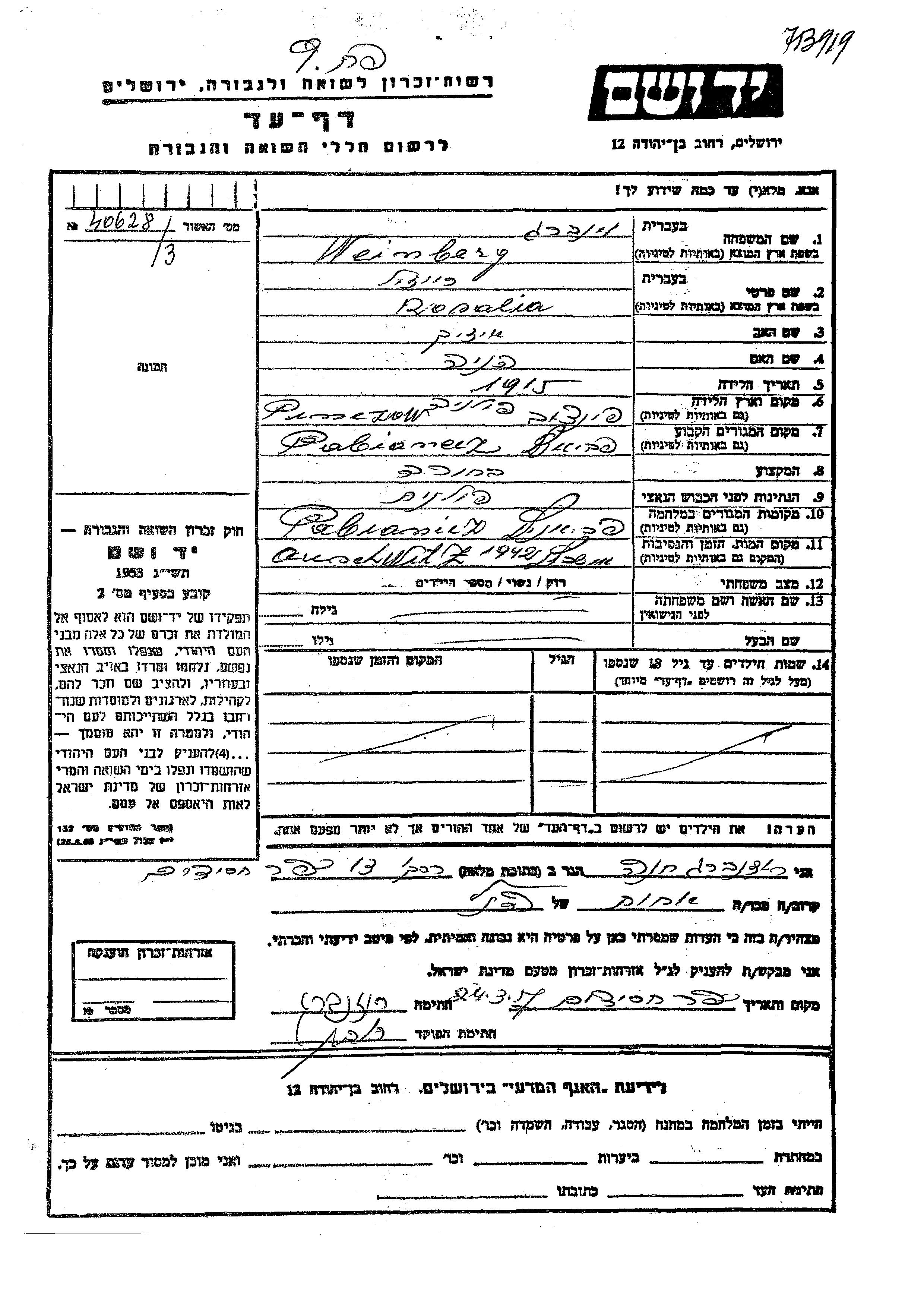 Rosalia Weinberg was born in Pinczow, Poland, 1915 to Itzik and Henia. She was a without profession and single. Prior to WWII she lived in Pabianitz, Poland. During the war she was in Pabianitz, Poland. Rosalia was murdered in the Shoah. Place of death: Auschwitz, Poland, 1942.