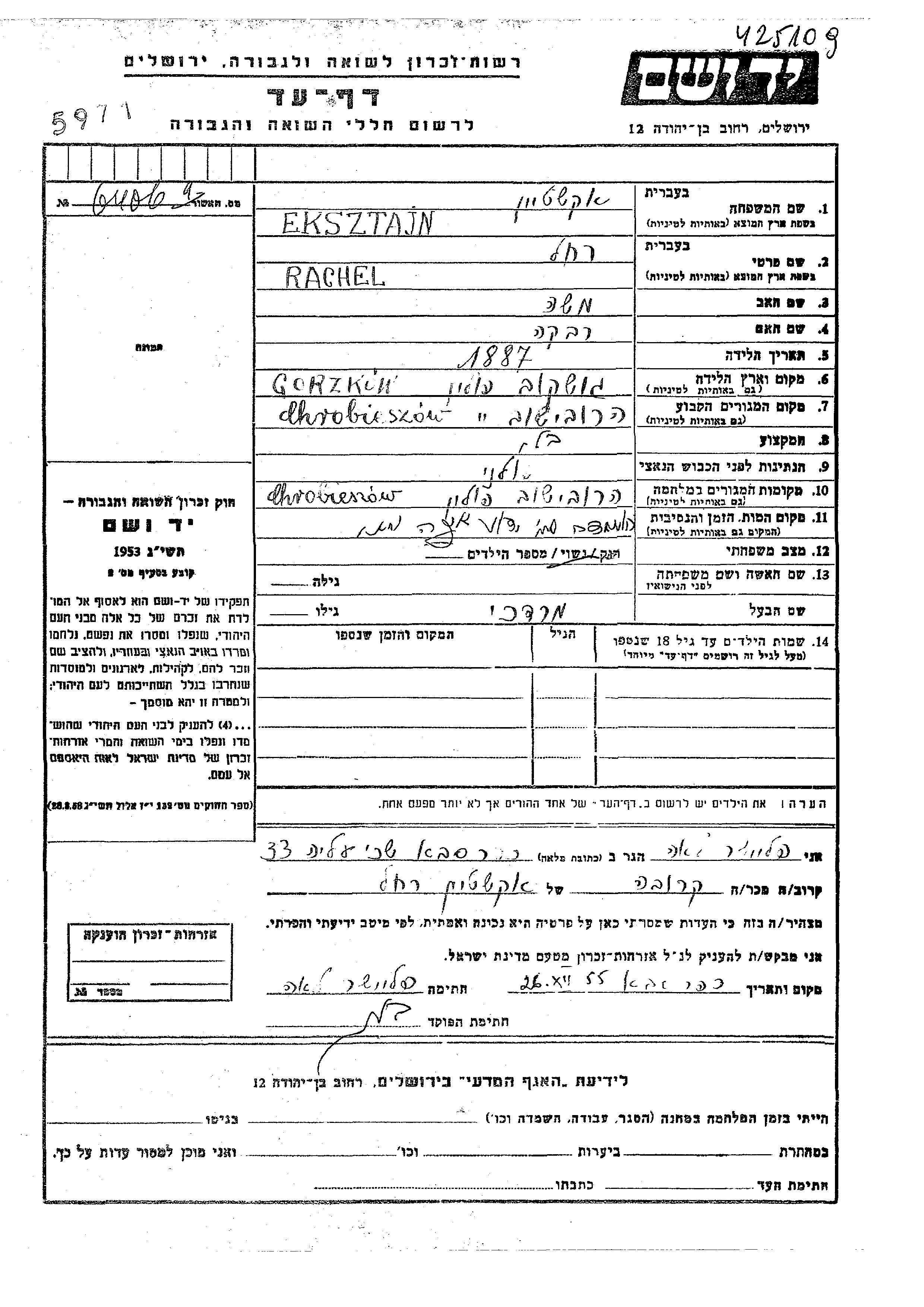 Rachel Eksztajn was born in Gorszkow, Poland, 1887 to Moshe and Rivka. She was a without profession and married to Mordekhai. Prior to WWII she lived in Hrubieszow, Poland. During the war she was in Hrubieszow, Poland. Rachel was murdered in the Shoah.