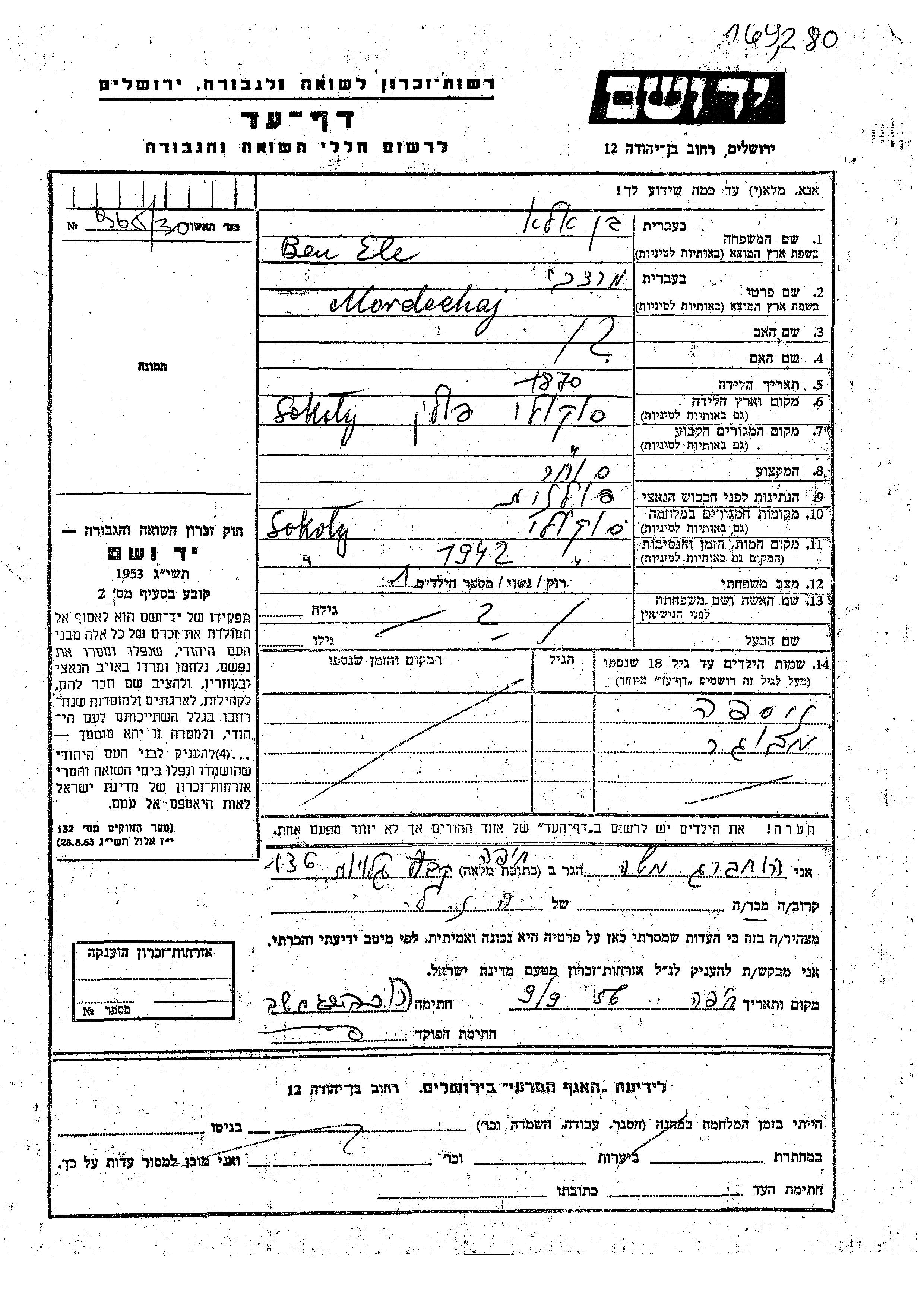 Ben Ele Mordechaj 1870 Sokoly, Poland Page of Testimony