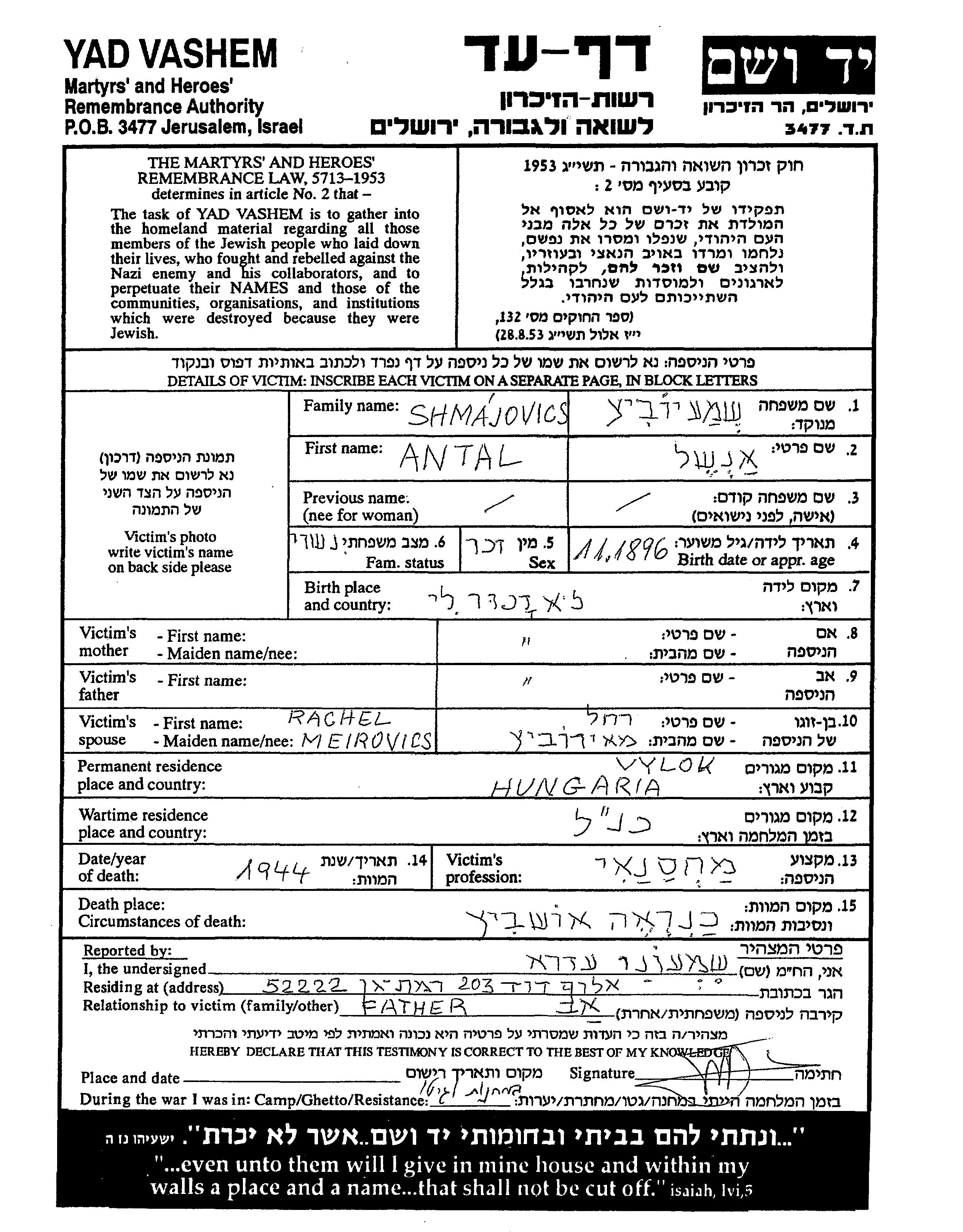 Antal Anshel Shmajovics was born, 1896. He was a warehouseman and married to Rachel nee Meirovics. Prior to WWII he lived in Vylok, Czechoslovakia. During the war he was in Vylok, Czechoslovakia. Antal Anshel was murdered in the Shoah. Place of death: Auschwitz, Poland, 1944.