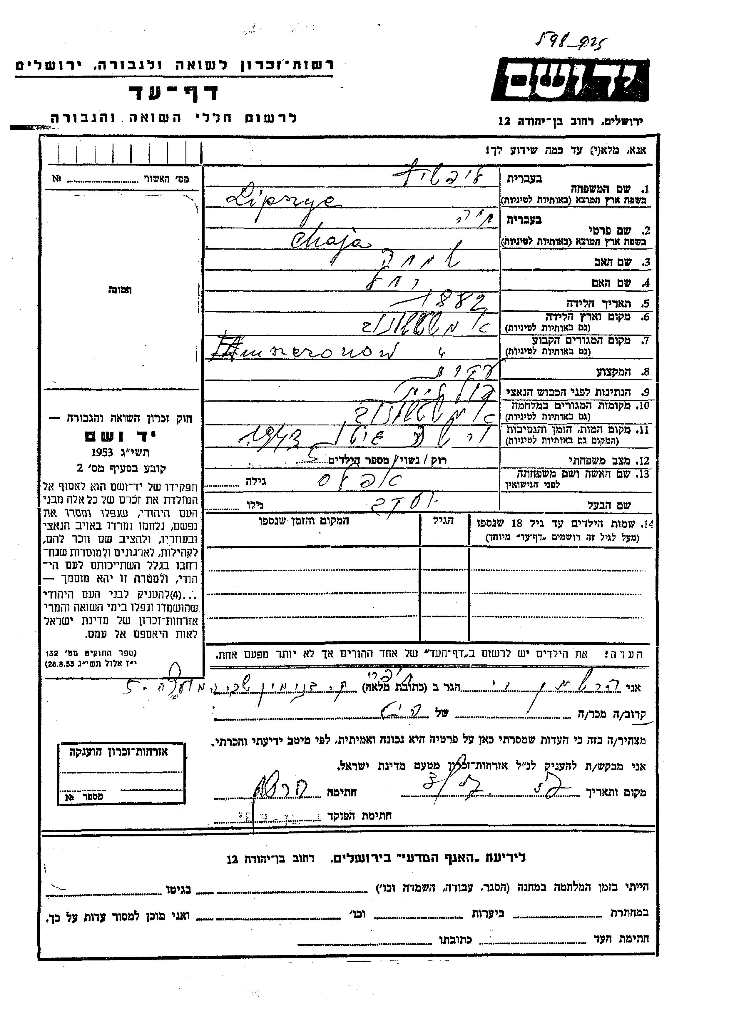 Chaja Lipszyc nee Apelas was born in Amszczonow, Poland, 1882 to Simkha and Rakhel. She was a housewife and married to Yaakov. Prior to WWII she lived in Warsaw, Poland. During the war she was in Amszczonow, Poland. Chaja was murdered in the Shoah. Place of death: Warsaw, Poland, 1943.