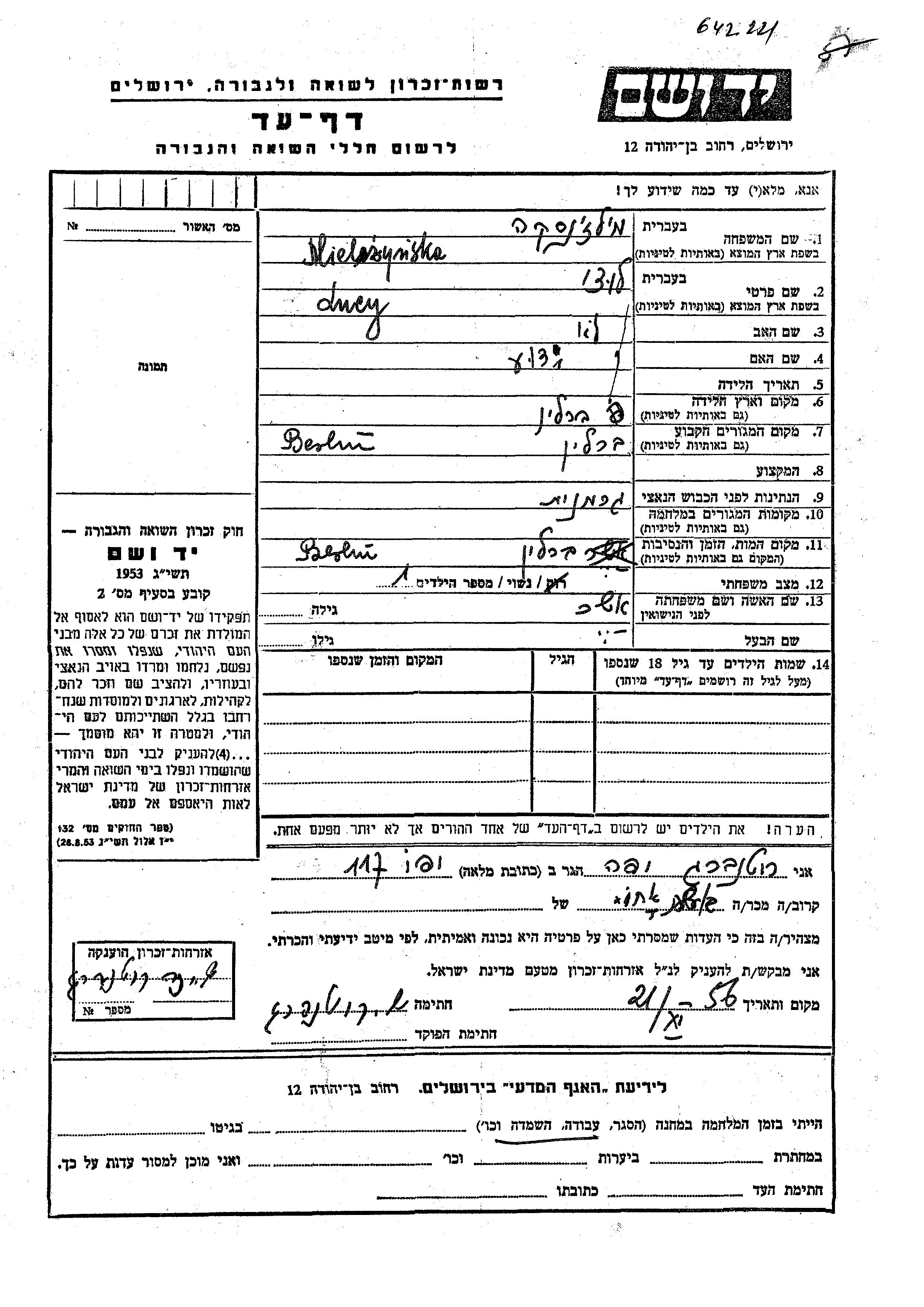 Yad Vashem - Pages of Testimony Names Memorial Collection