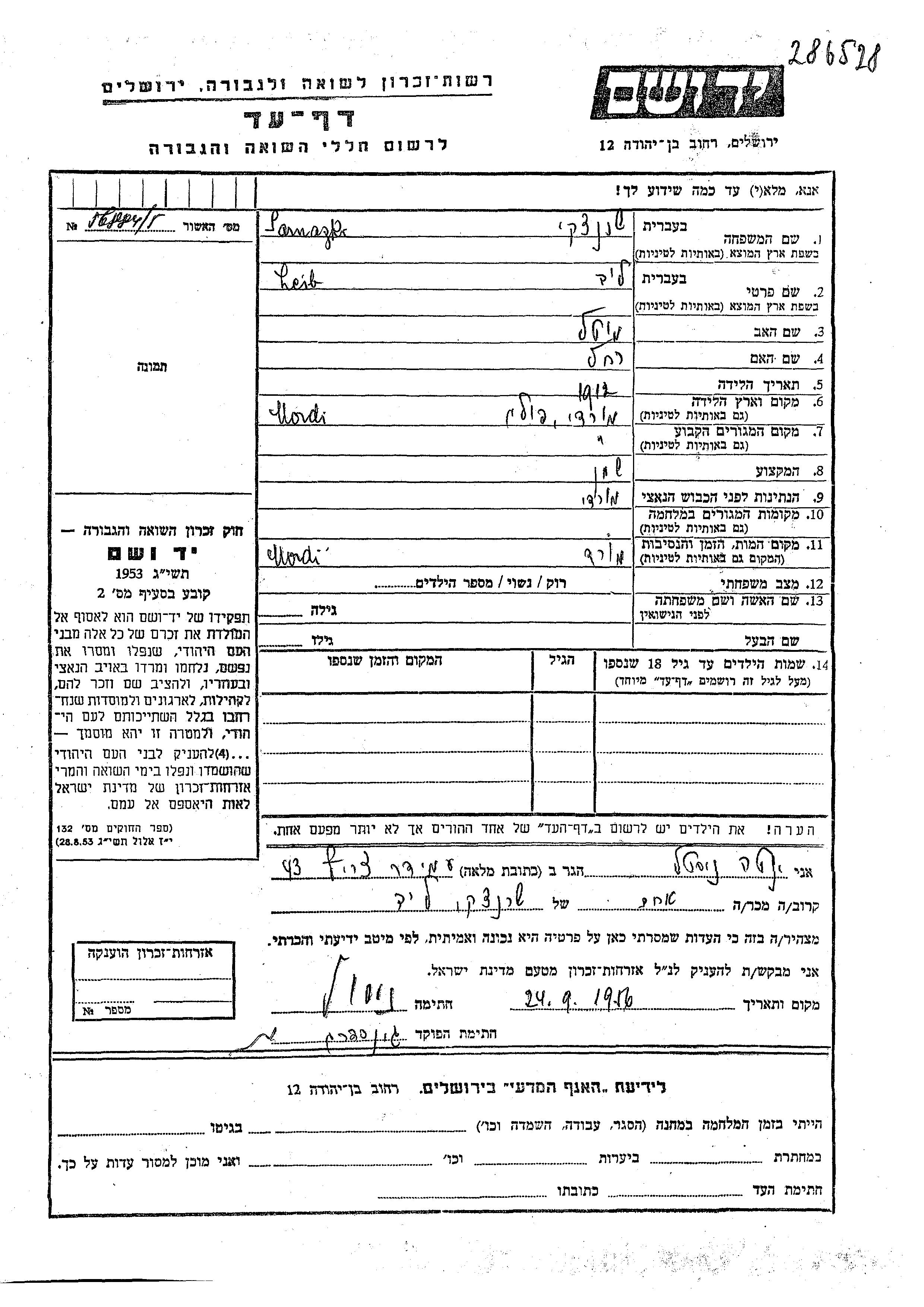 Yad Vashem - Pages of Testimony Names Memorial Collection
