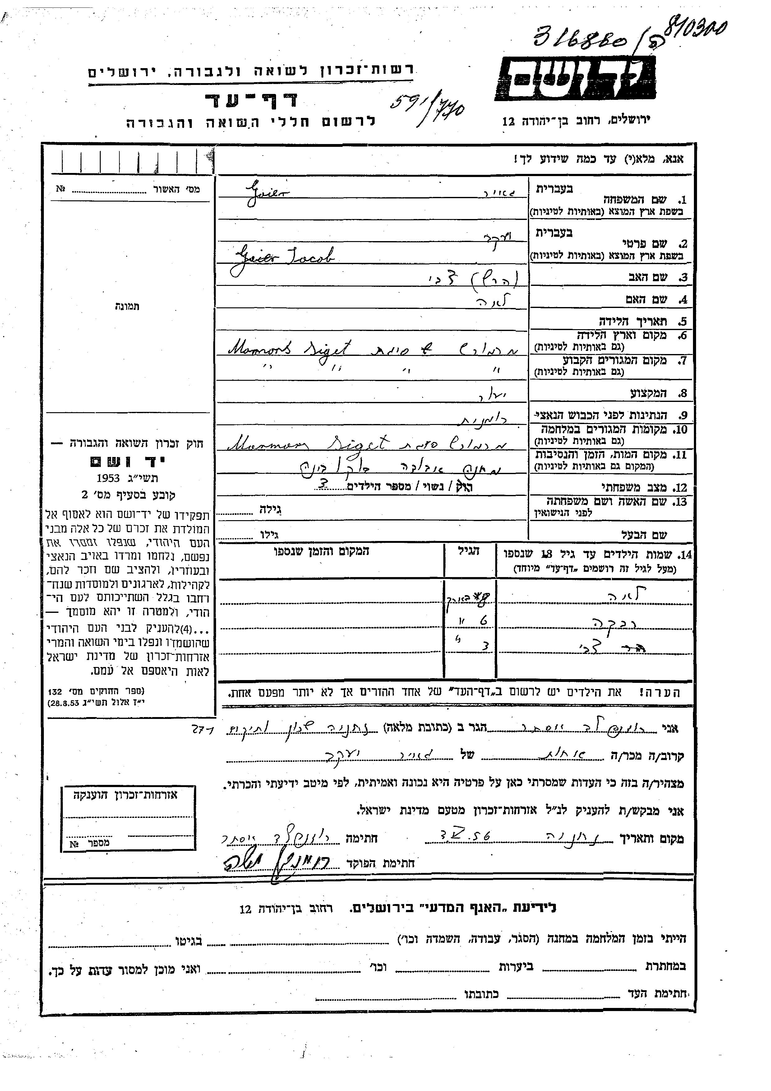 Geier Goier Jacob Siget, Romania Page of Testimony