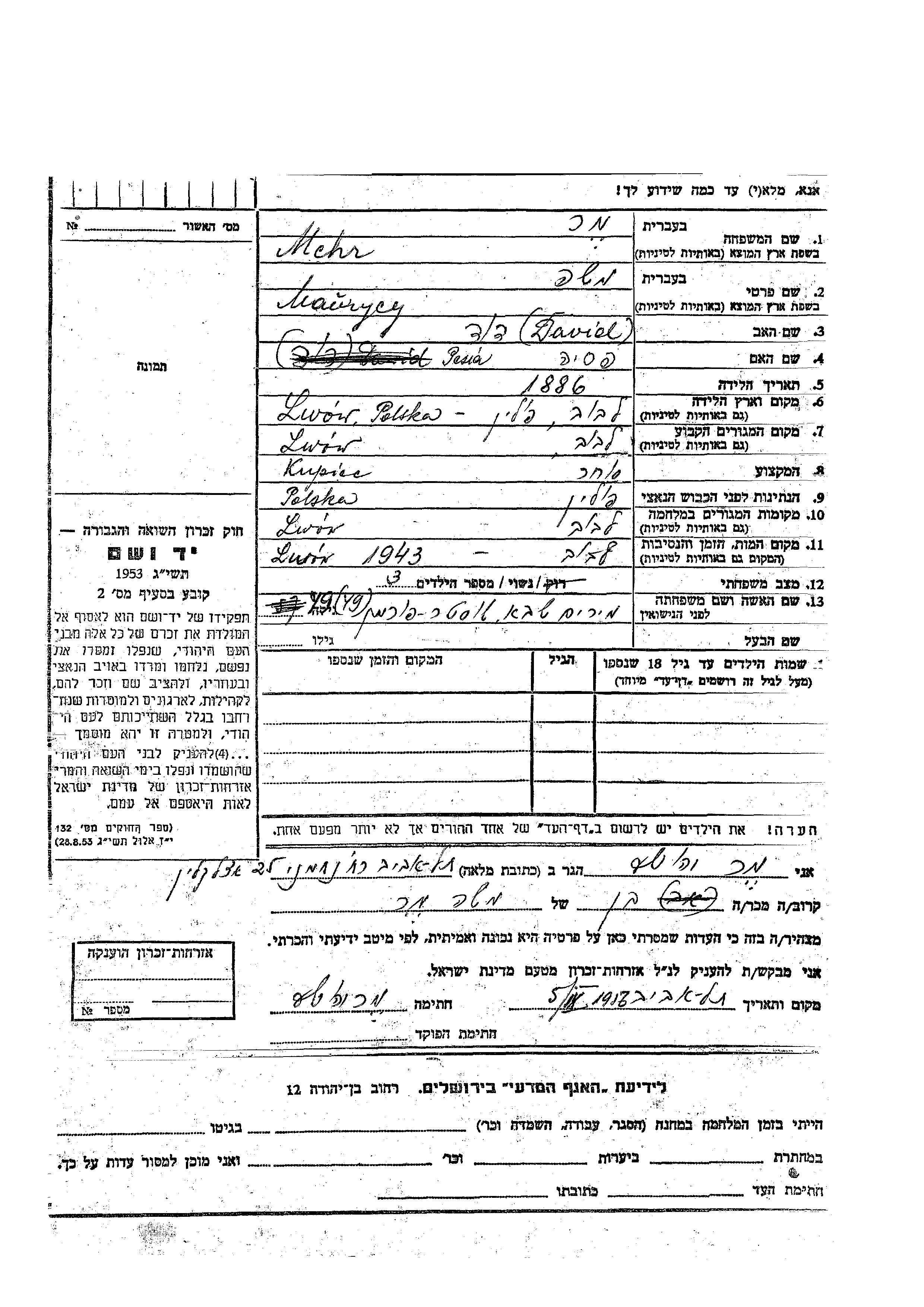 Maurycy Moshe Mehr was born in Lwow, Poland, 1886 to David and Pesia. He was a merchant and married to Miriam Sheva nee Furman. Prior to WWII he lived in Lwow, Poland. During the war he was in Lwow, Poland. Maurycy Moshe was murdered in the Shoah. Place of death: Lwow, Poland, 1943.