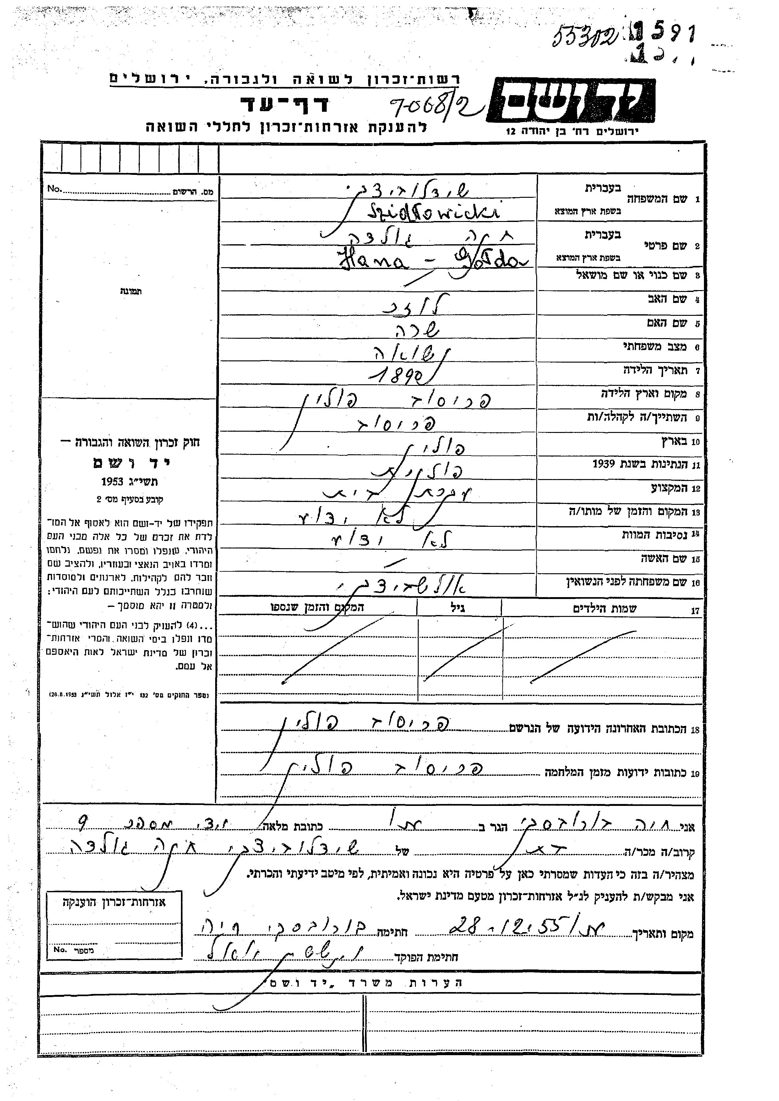 Hana Golda Szidlowicki nee Shidlovitzki was born in Parysow, Poland, 1890 to Luzer and Sara. She was a housewife and married. Prior to WWII she lived in Parysow, Poland. During the war she was in Parysow, Poland. Hana Golda was murdered in the Shoah.